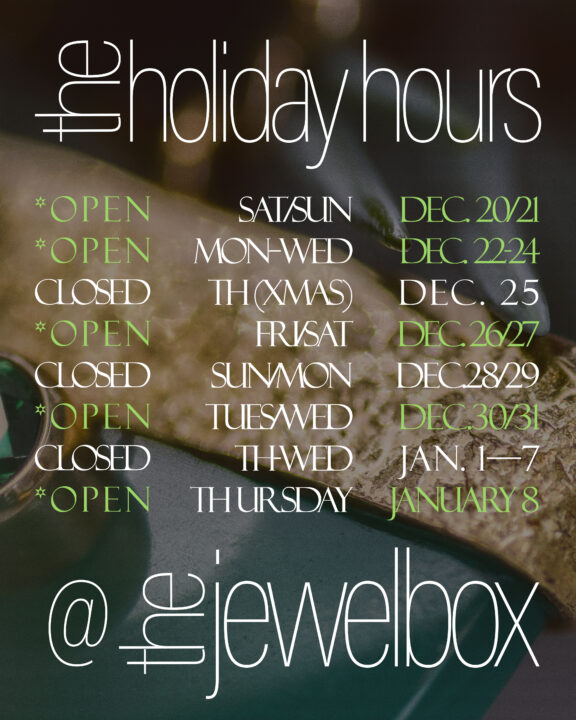 Holiday Hours 2025/2026 Holidays are The Jewelbox’s busiest time of the year! We are open extra hours and extra days for convenience, but we’ll be taking a short break around the new year.