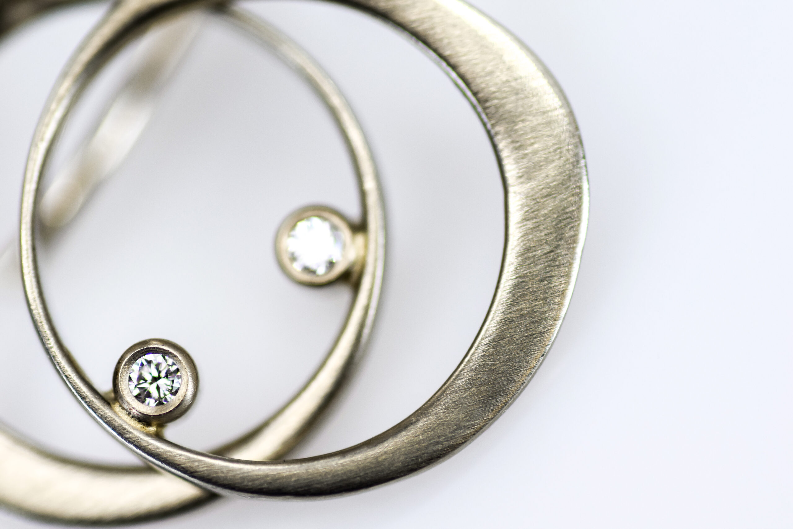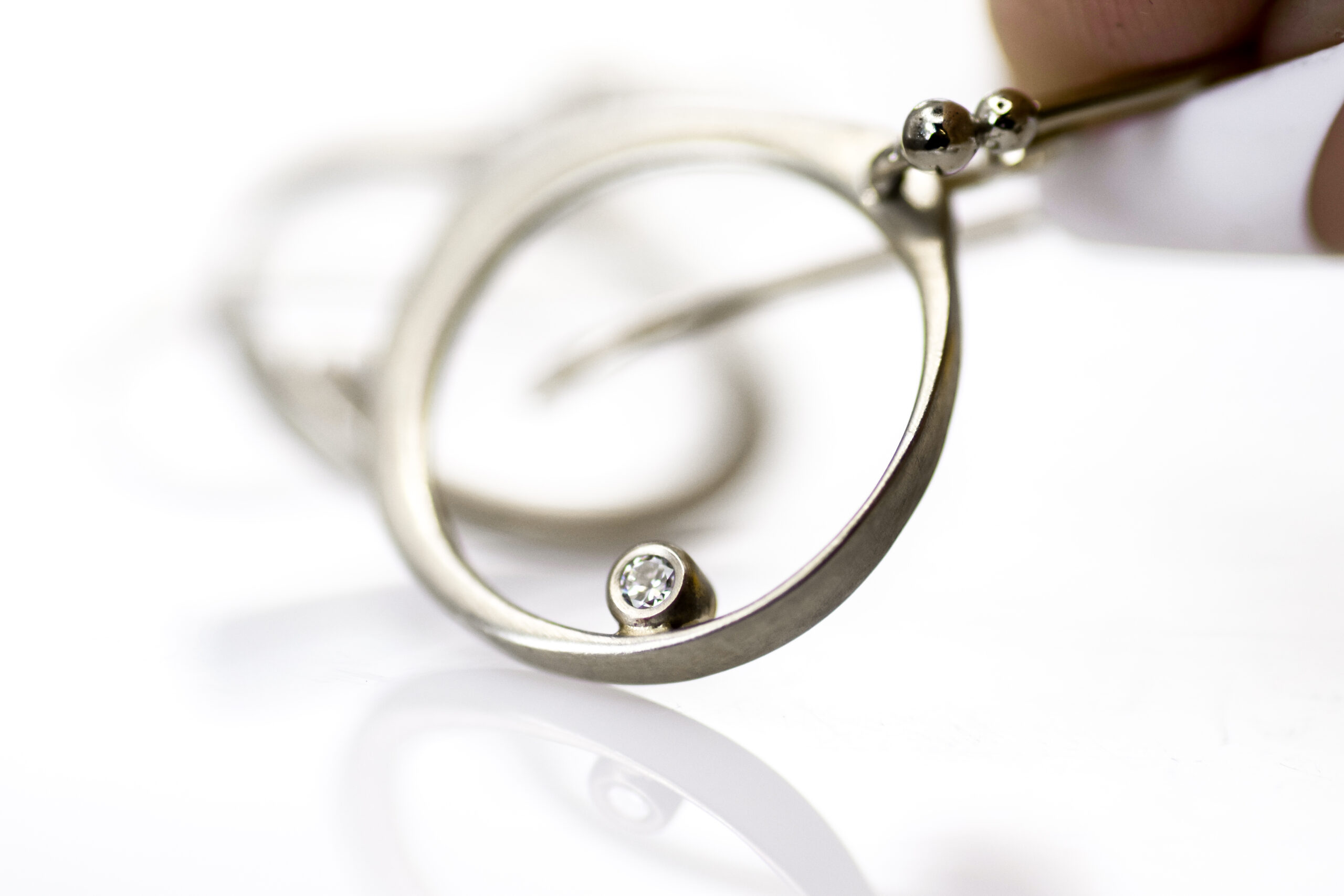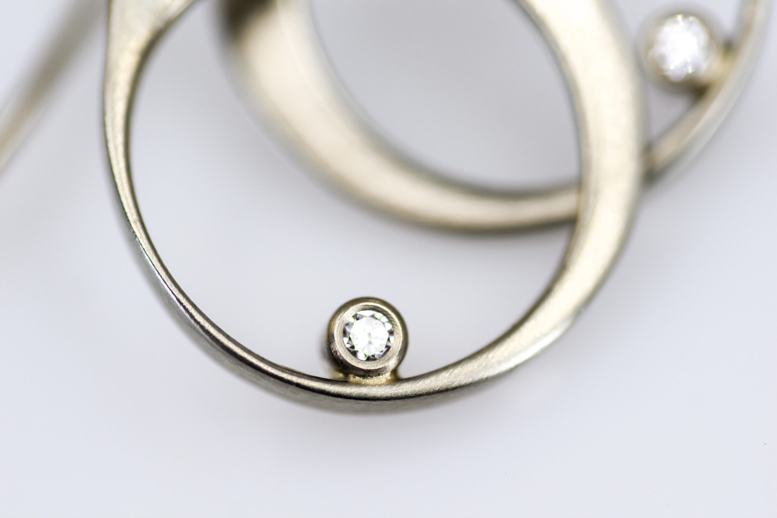 A pair of diamonds is set inside these slightly irregular hoop-alternatives. Artful but classic, even the French hooks are detailed with gold beads.