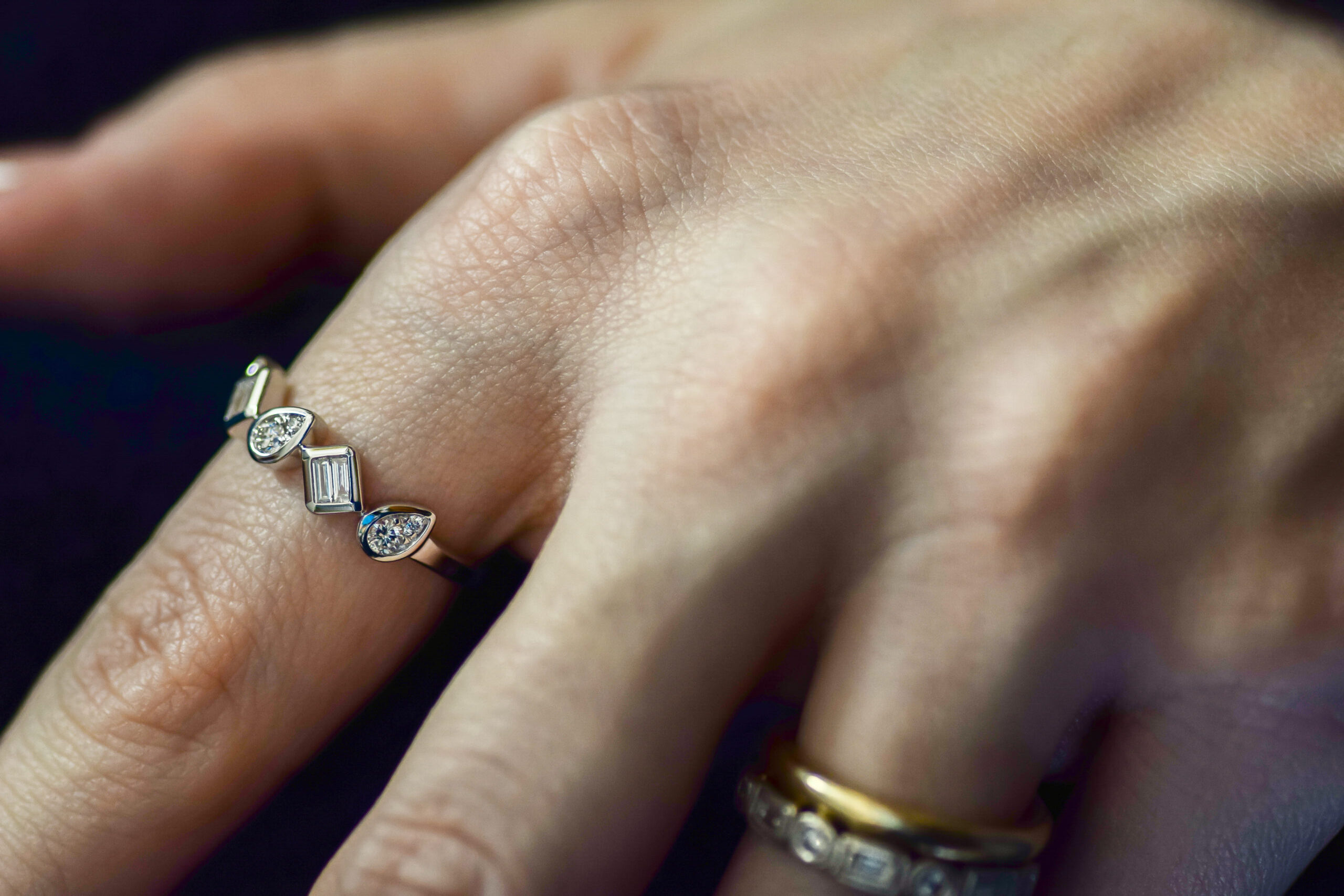 Playful, yet refined, each shape is made up of multiple small diamonds, in the style of French navette settings. Size 6.5.