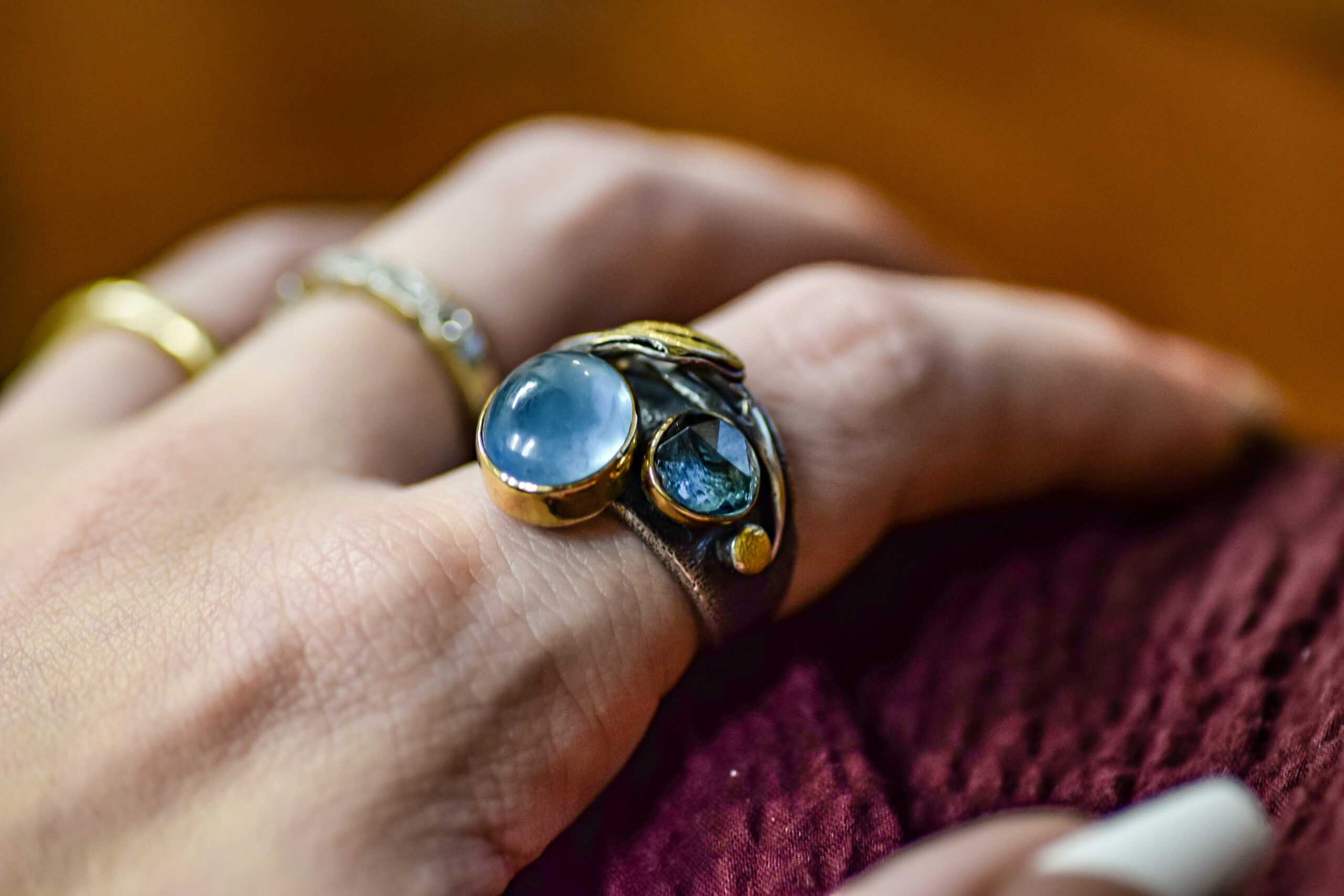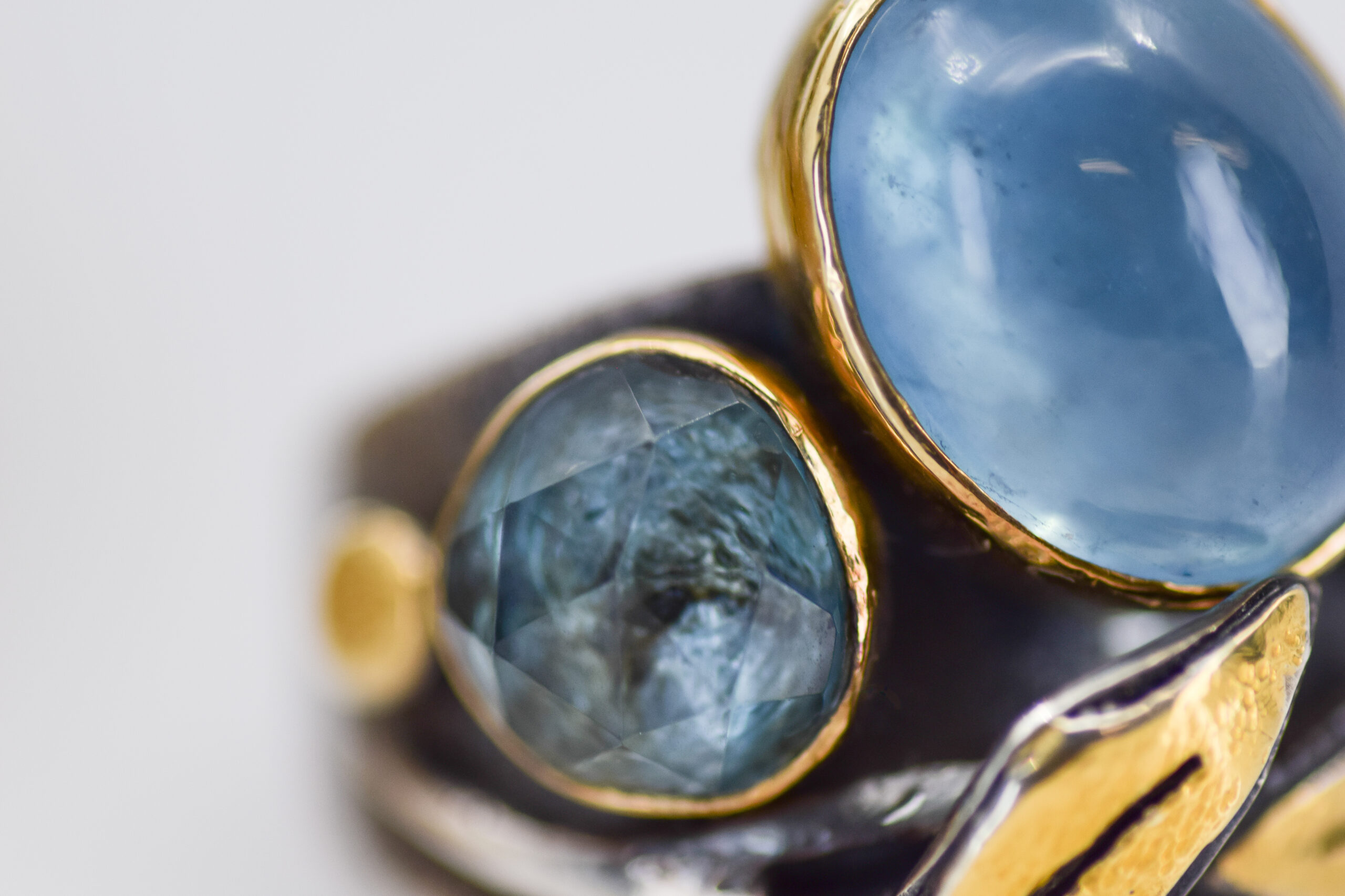 Stones: 2x Swiss blue topaz / Santa Maria Aquamarine cabochon