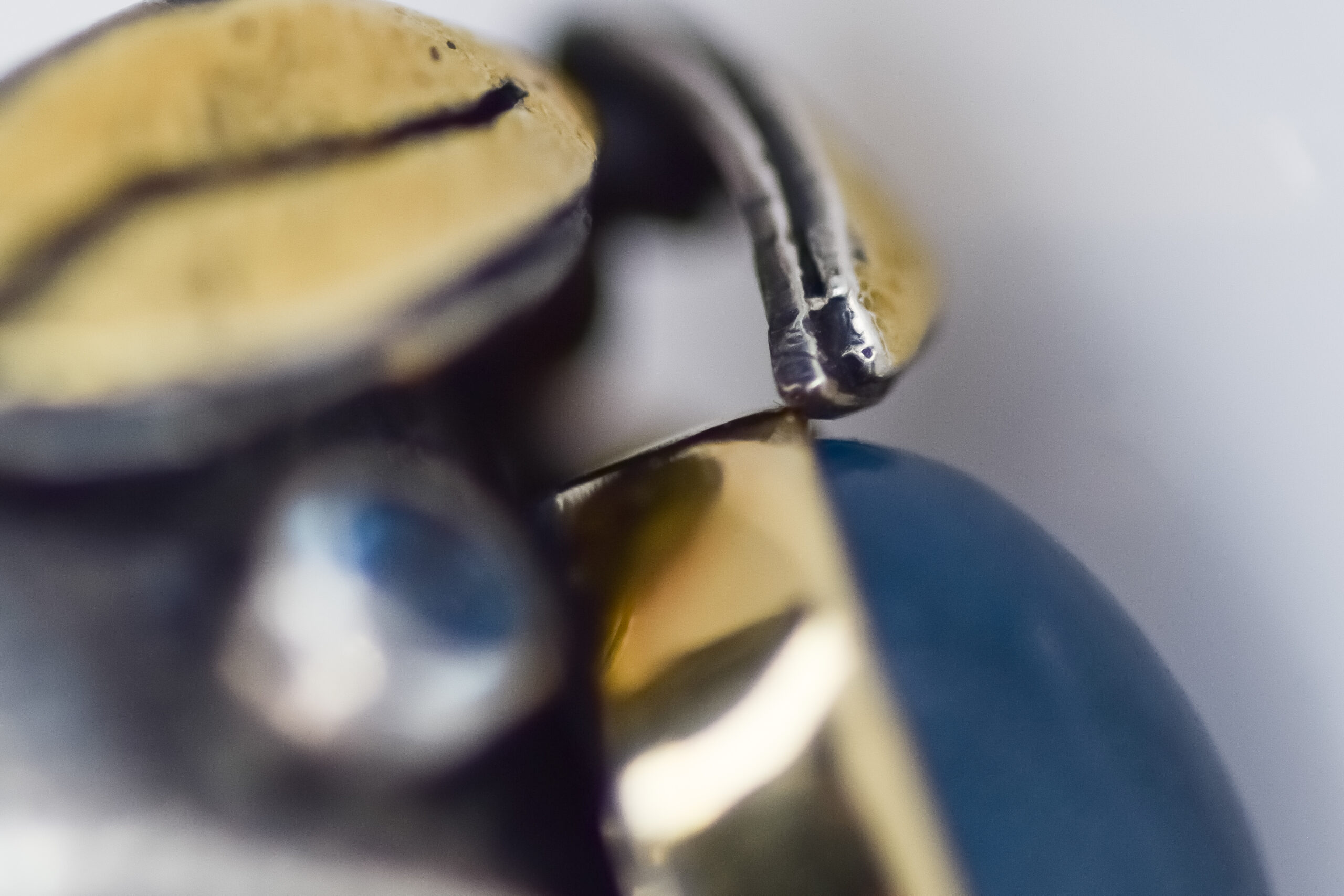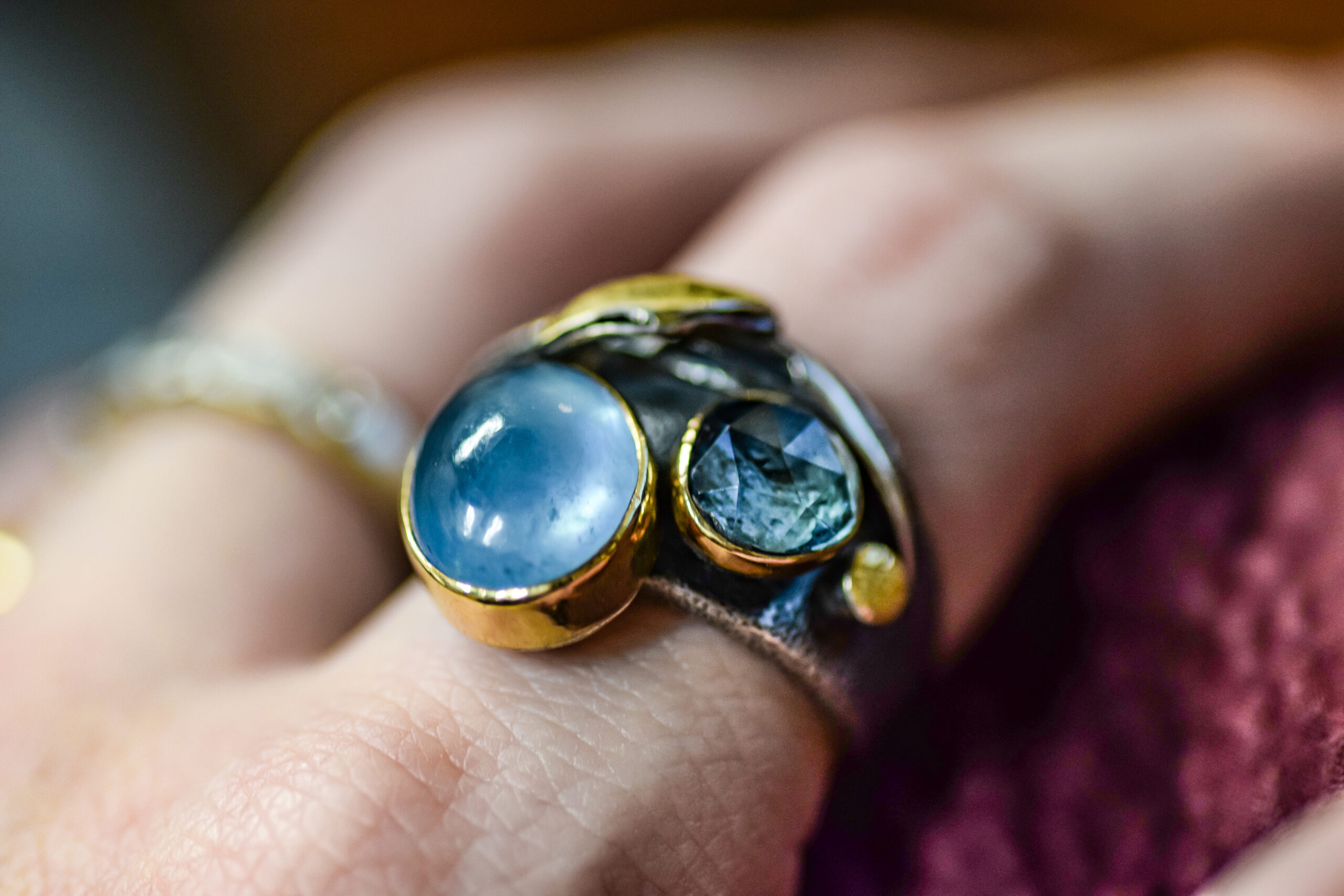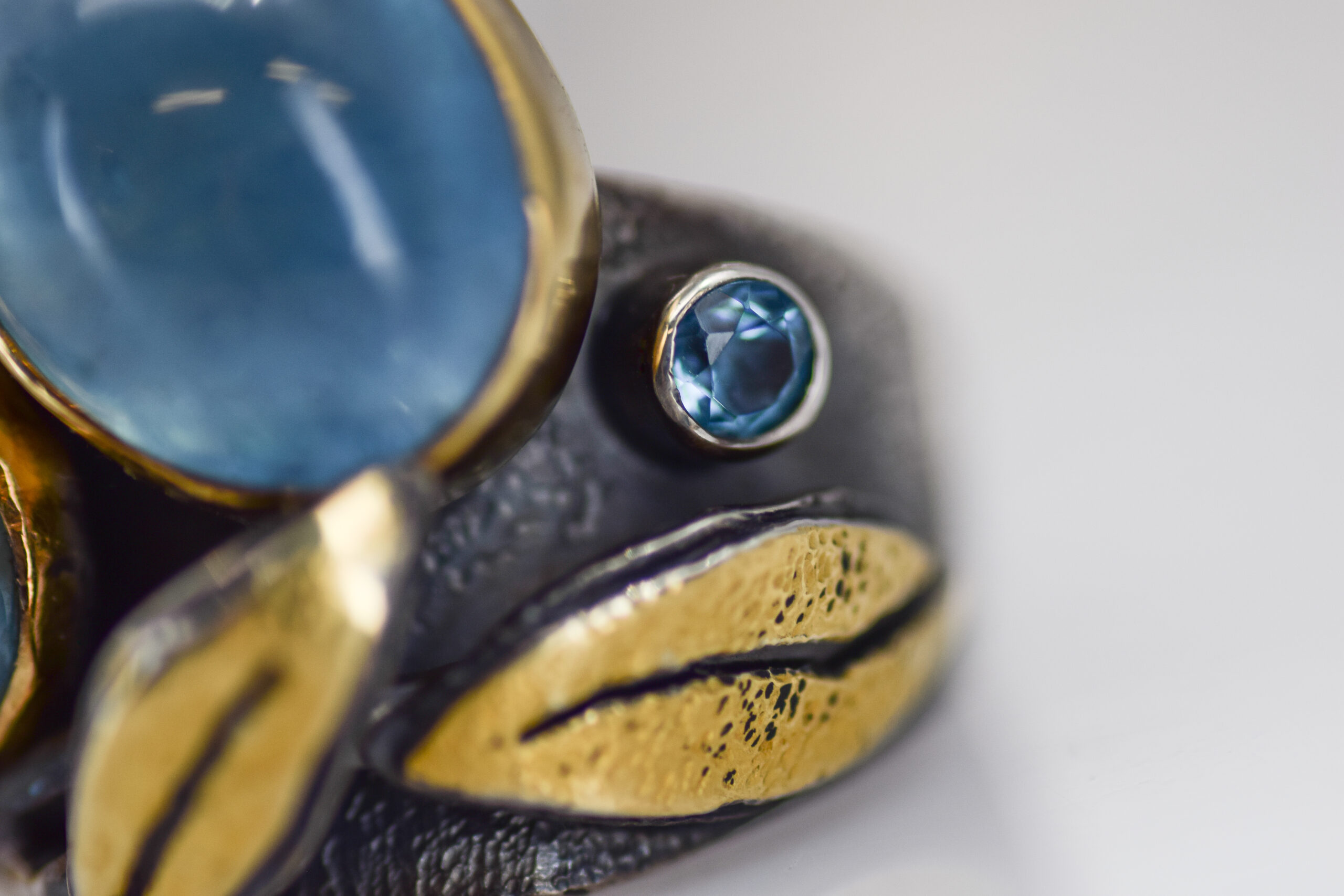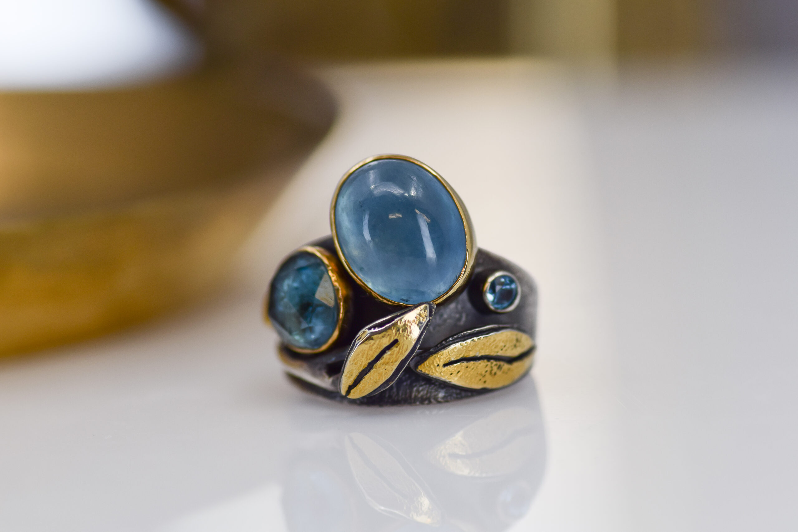 If you mix metals well, this one’s for you. Textured silver meets polished gold, highlighting both the natural imperfections and exquisite craftmanship in these stones. A cabochon-cut Santa Maria aquamarine positions itself between a pair of mis-matched, faceted Swiss blue topaz. Gold pin and leaf details.