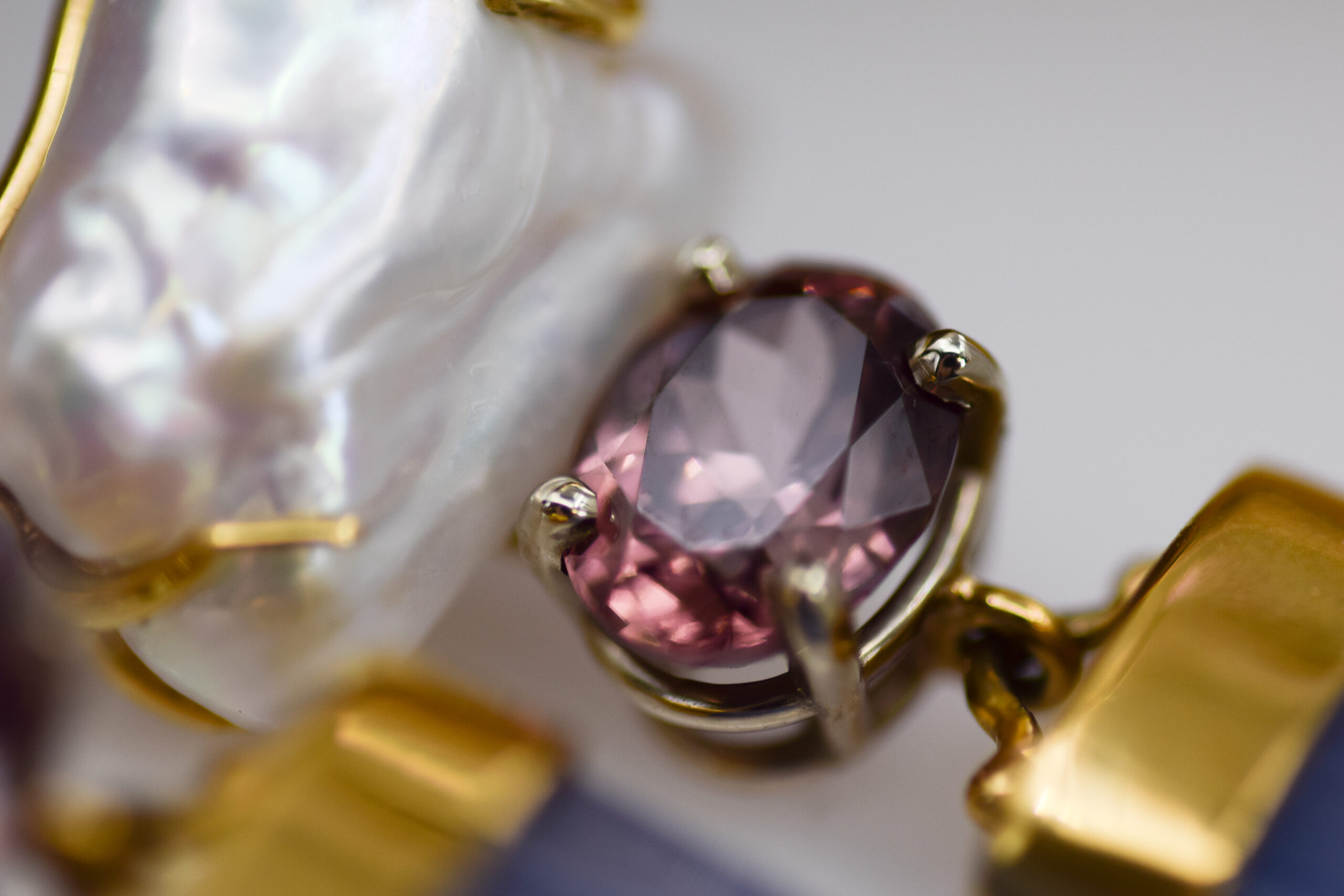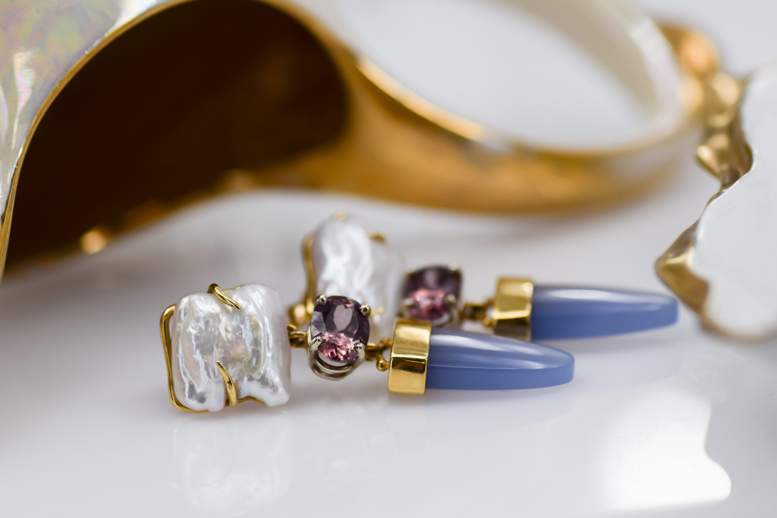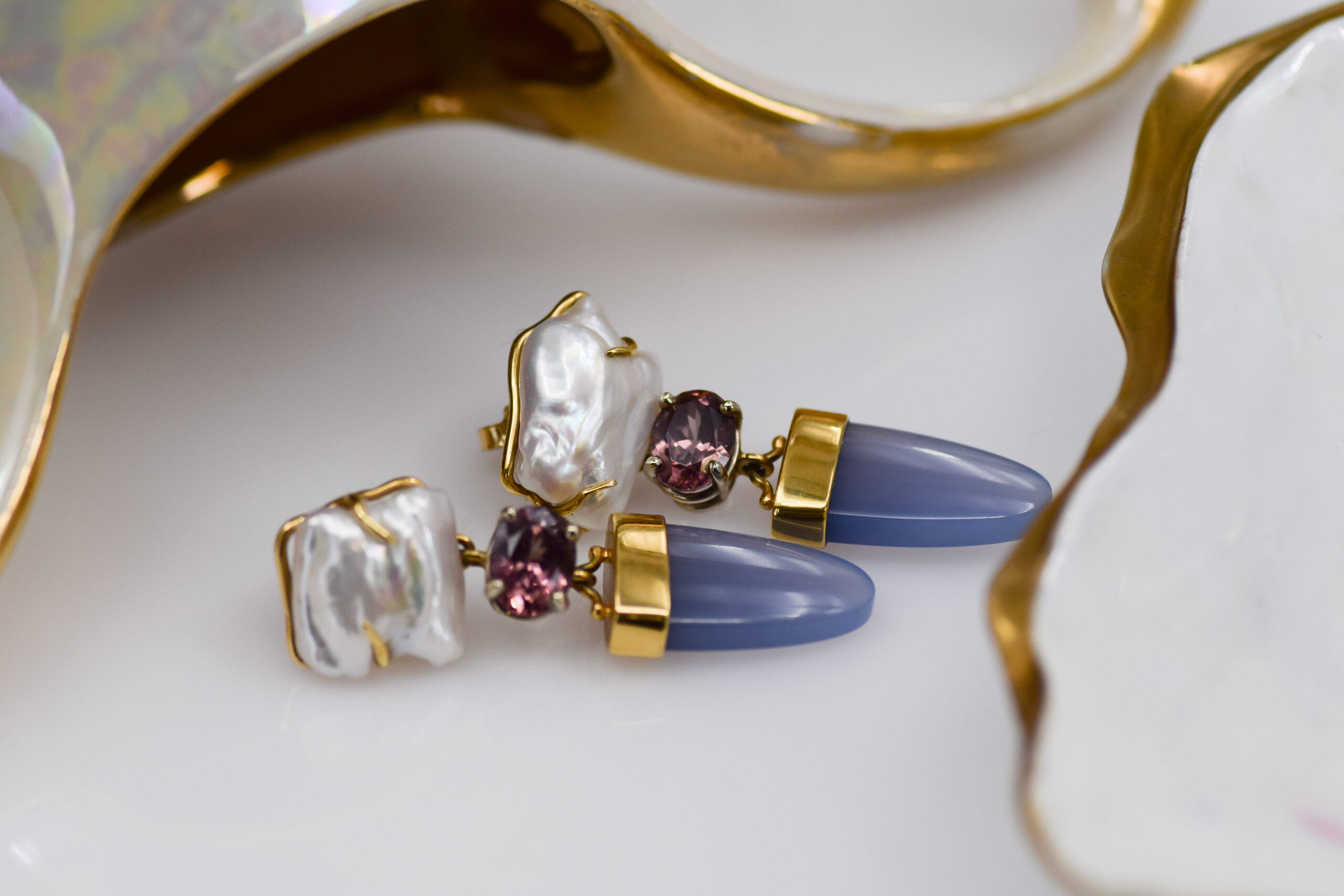 Not just any pearls: baroque pearls. Not just any zircon: rosy zircon. And not just any chalcedony: the prettiest lilac-blue microcrystalline quartz you ever saw. Set in 14k yellow gold, these earrings are for the traveller at heart. Worldly, curated, and ready-to-wear. Only one pair.