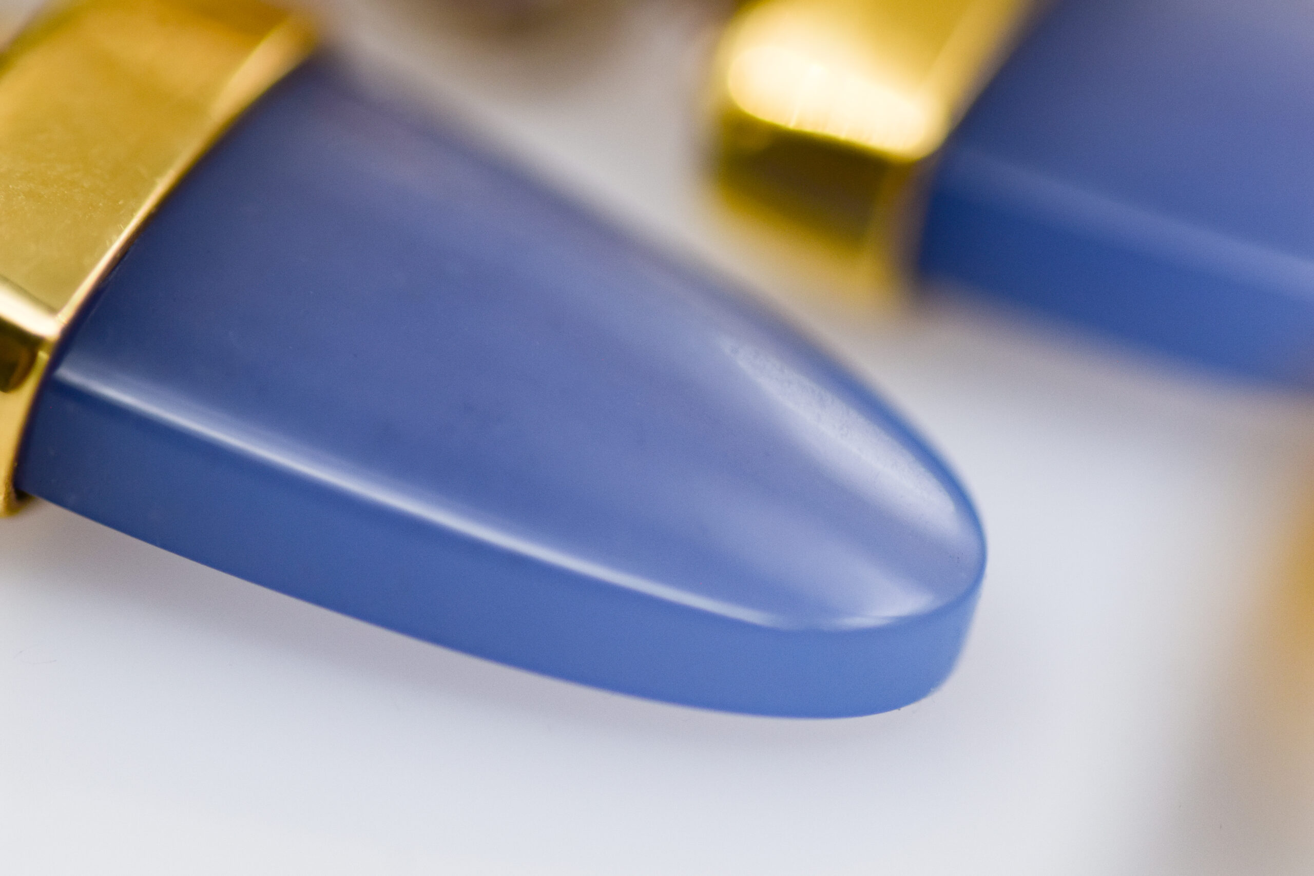 Stones: 4.81ctw faceted rosy zircon pair / baroque pearl pair / blue chalcedony bullet cabochons.