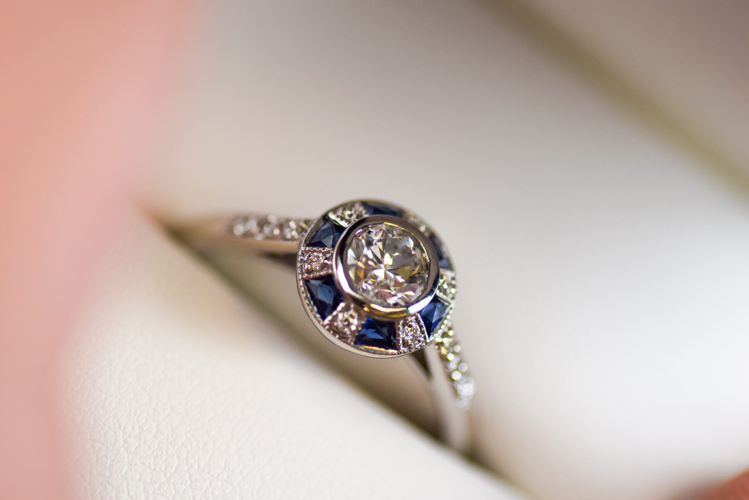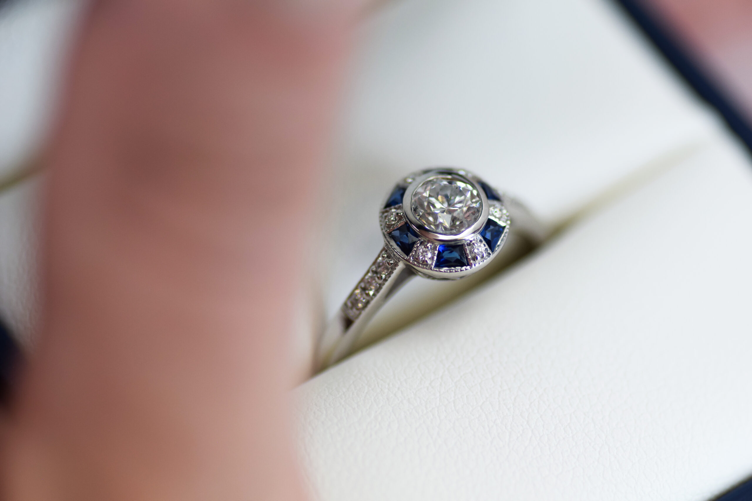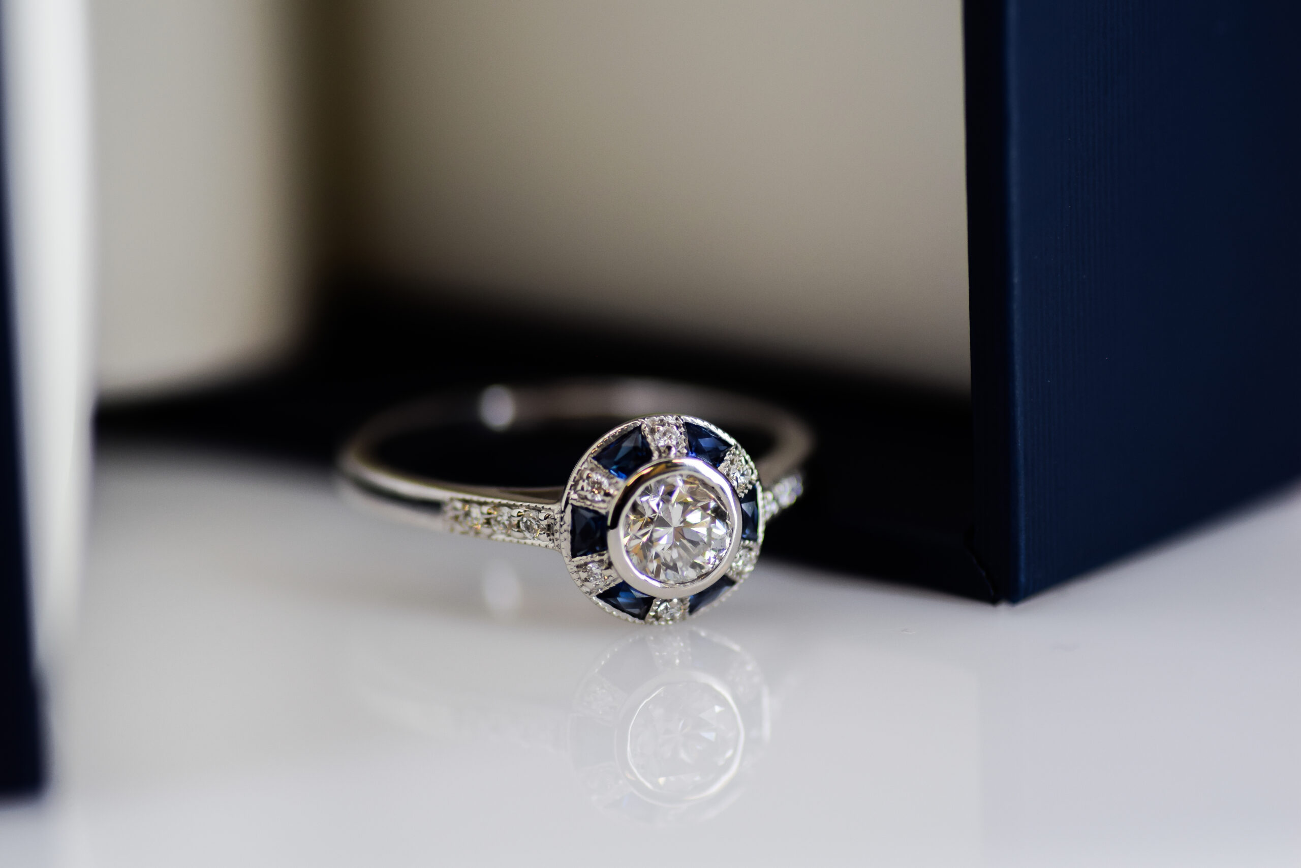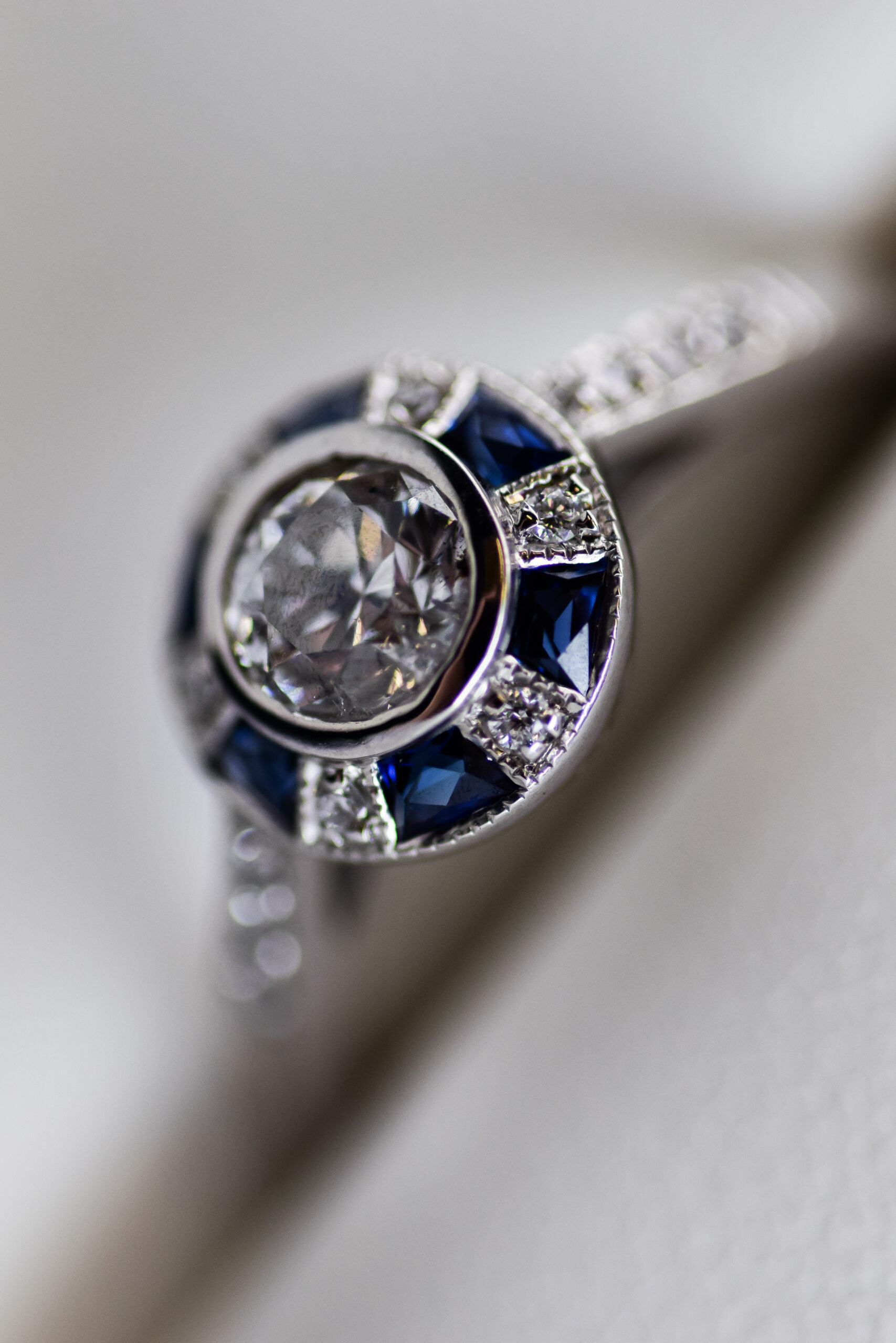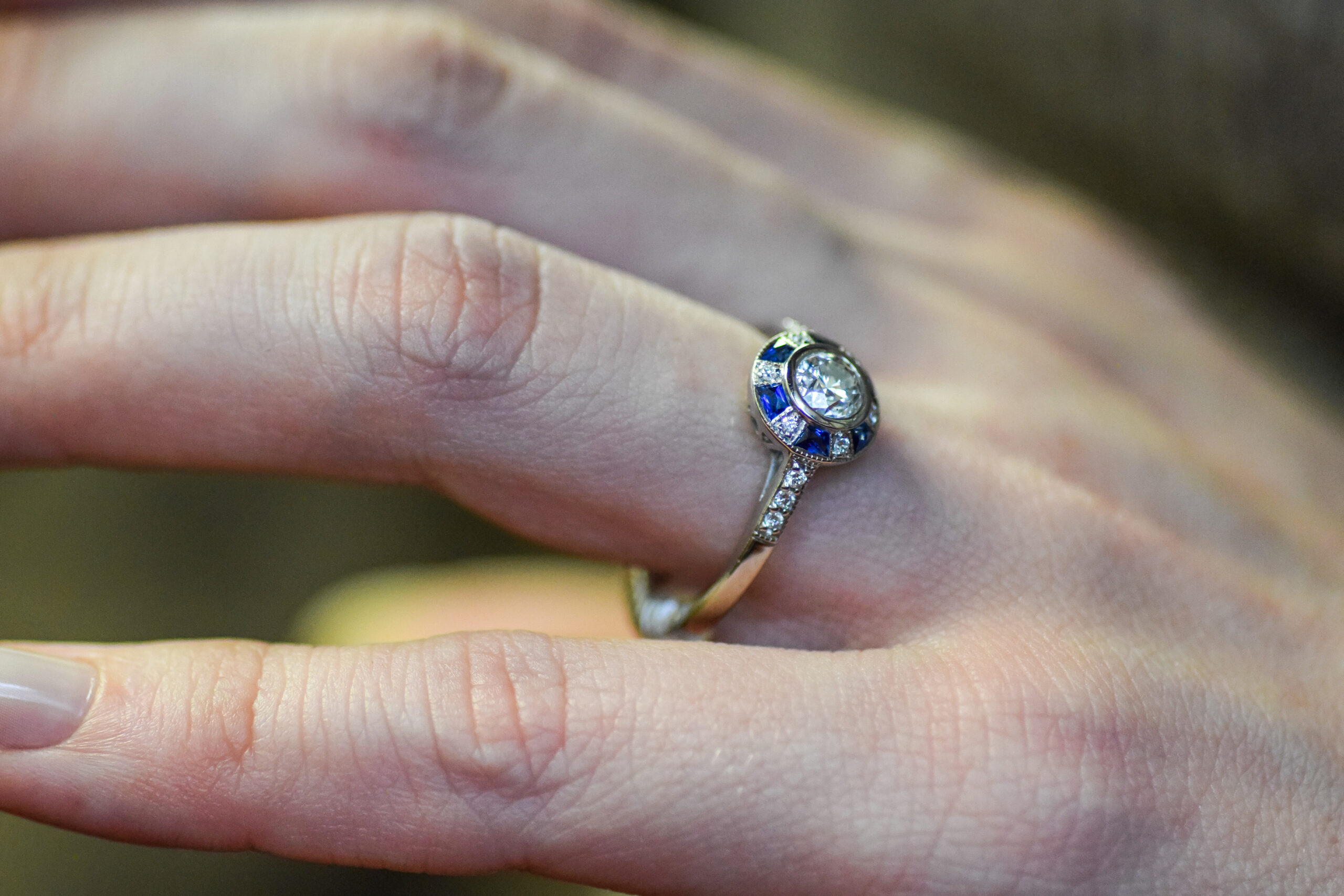 This ring was tucked among the royal jewels in the castle coffers. A halo of alternating deep blue sapphire and brilliant diamond, surrounding an unblemished center stone. Unassuming among tiaras, but a stunning piece of history on the hand.