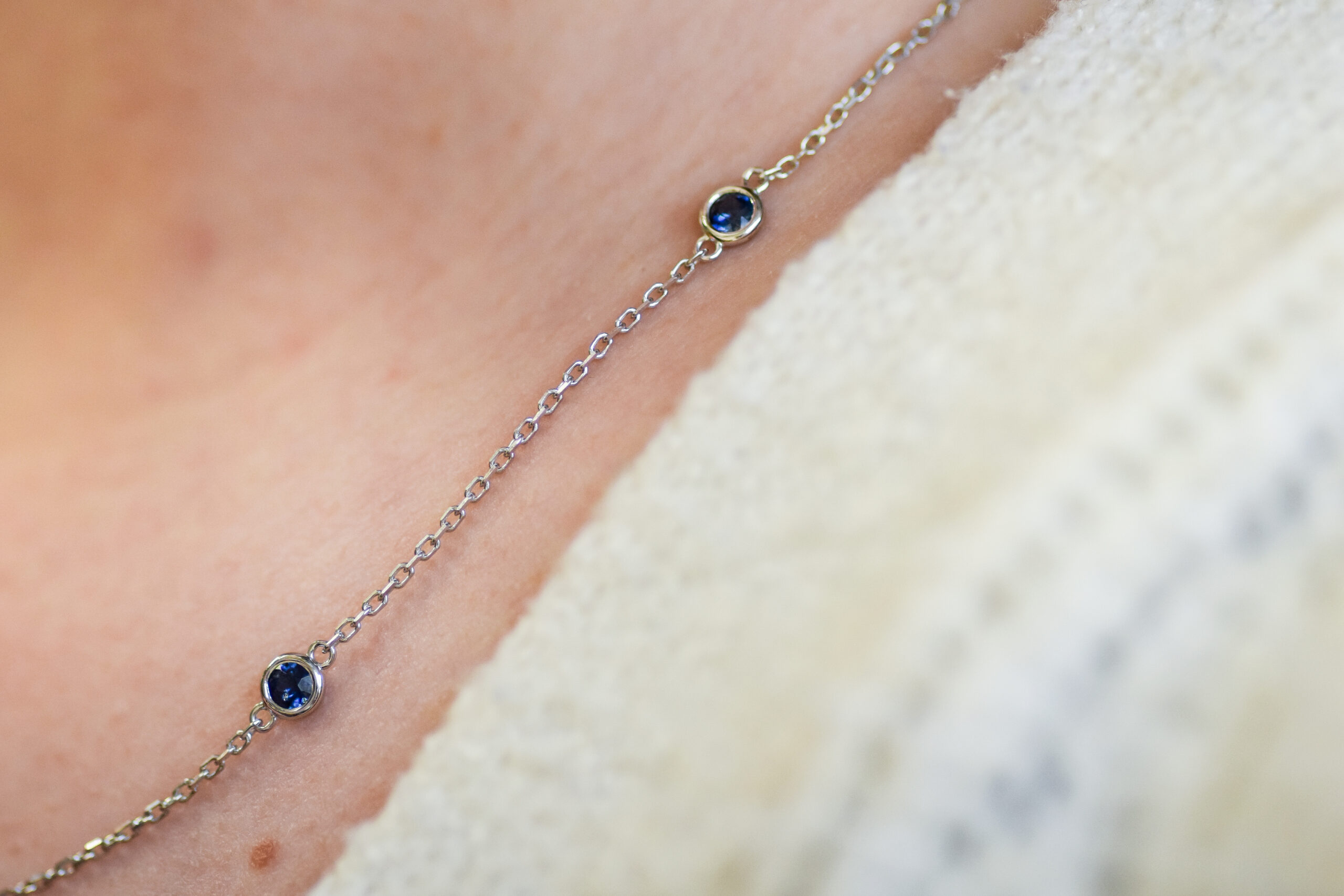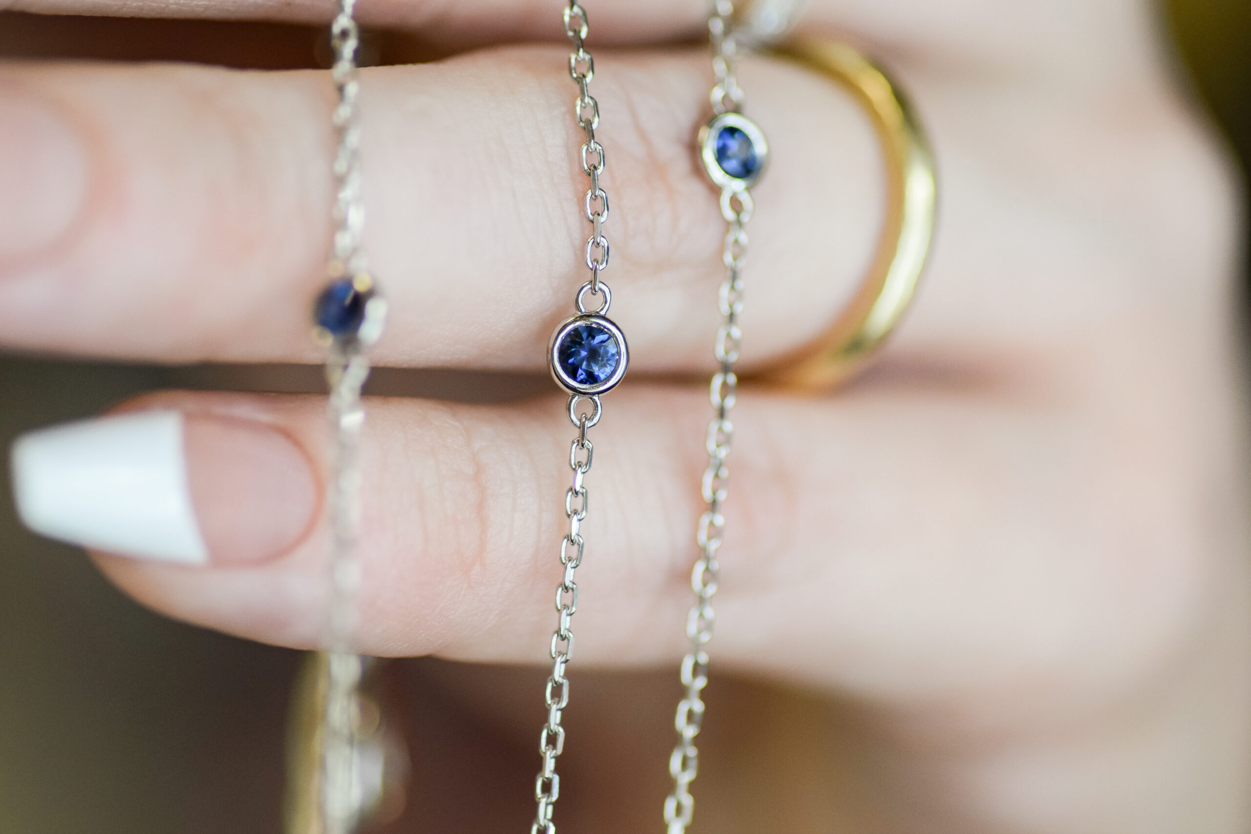 An obvious choice for fans of quiet luxury; bezel-framed blue sapphires let peeks of light illuminate their delicate colors. Layer boldly, or let your taste speak for itself.