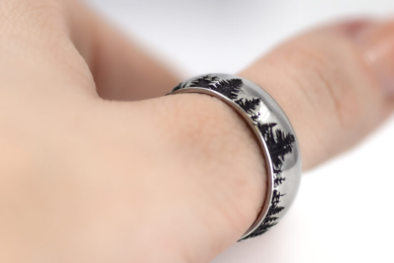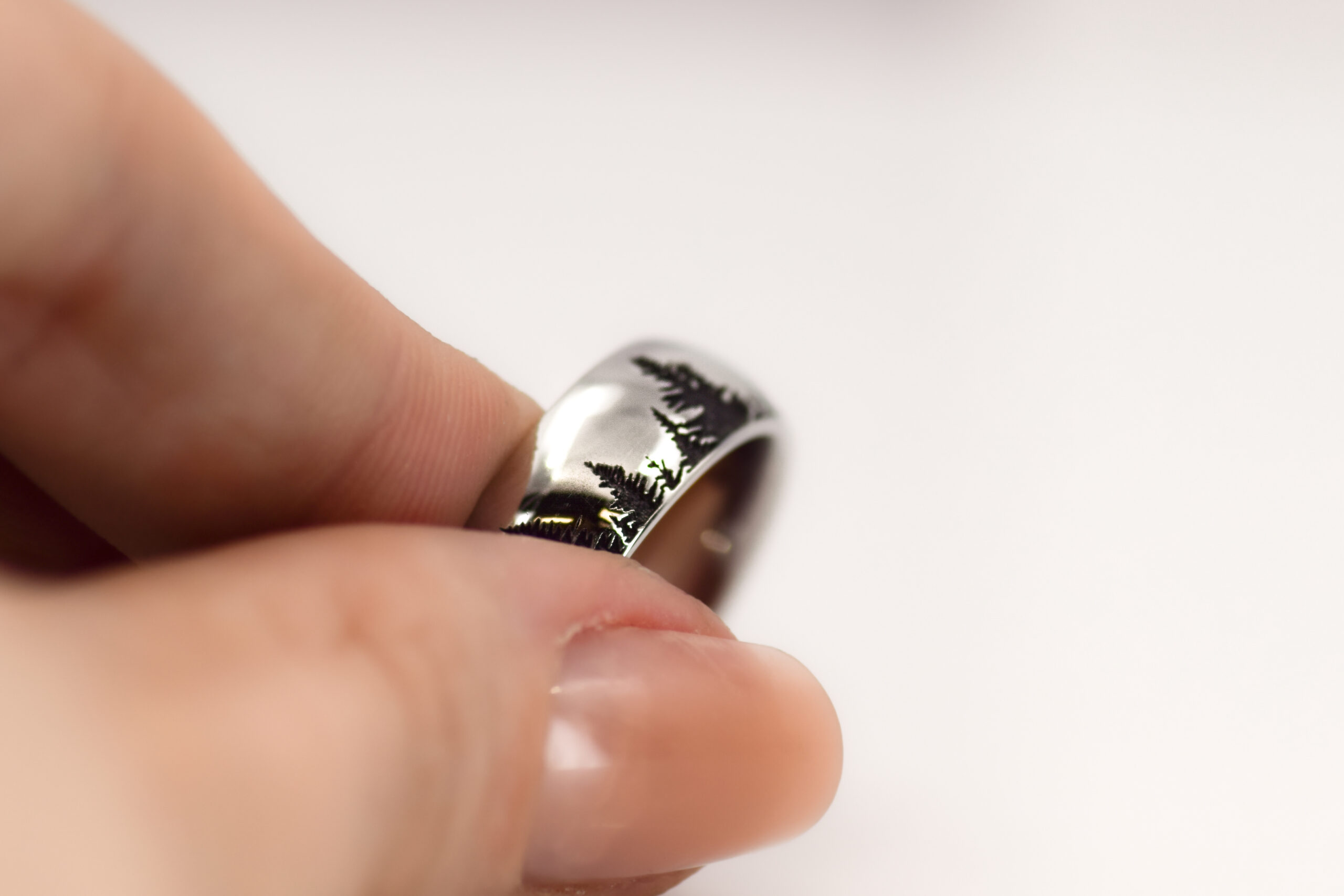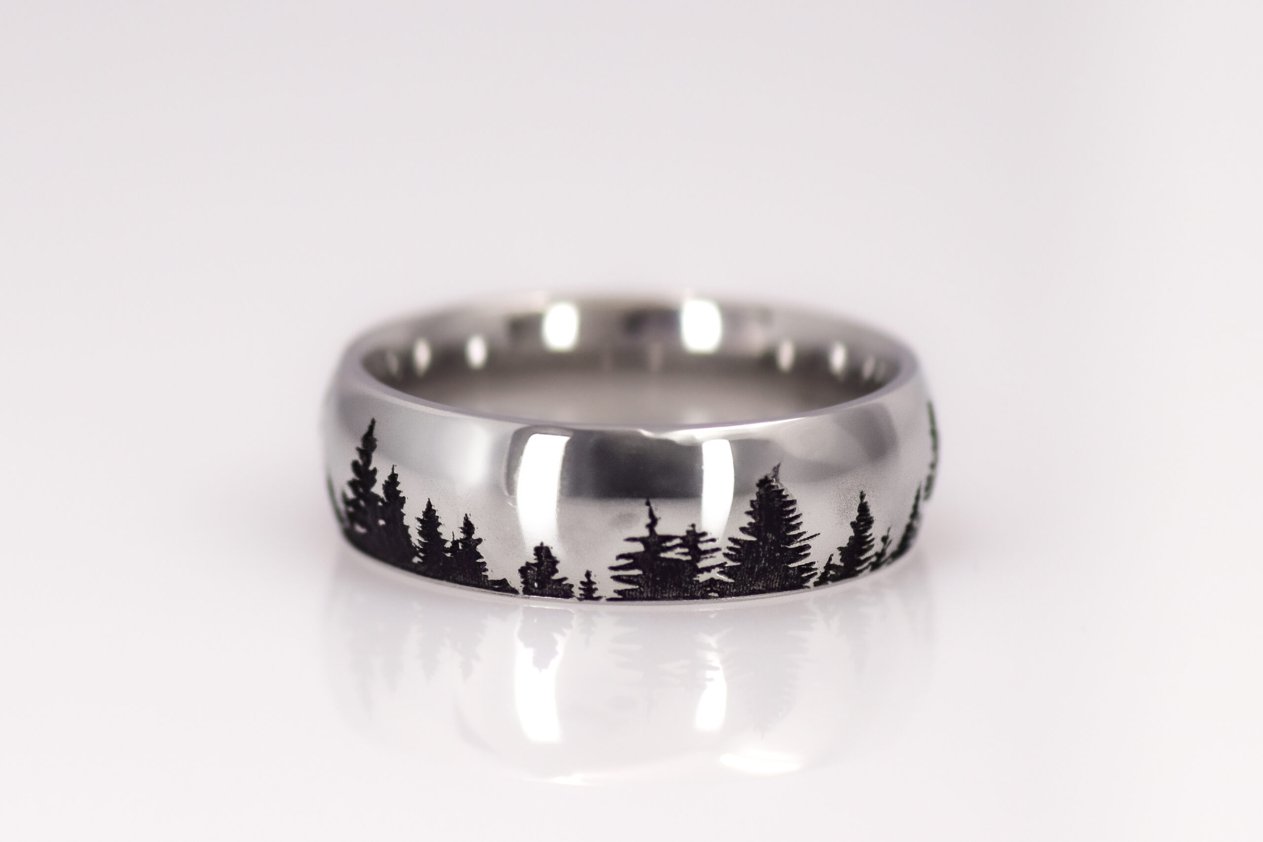 Handsome and personal, this cobalt-chrome band retains a pleasing simplicity with stark black, enamel silhouettes of fir trees around its base.