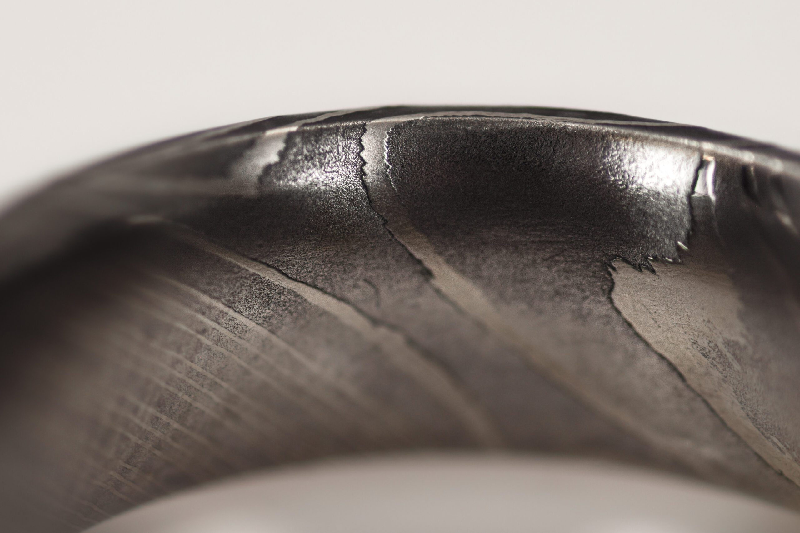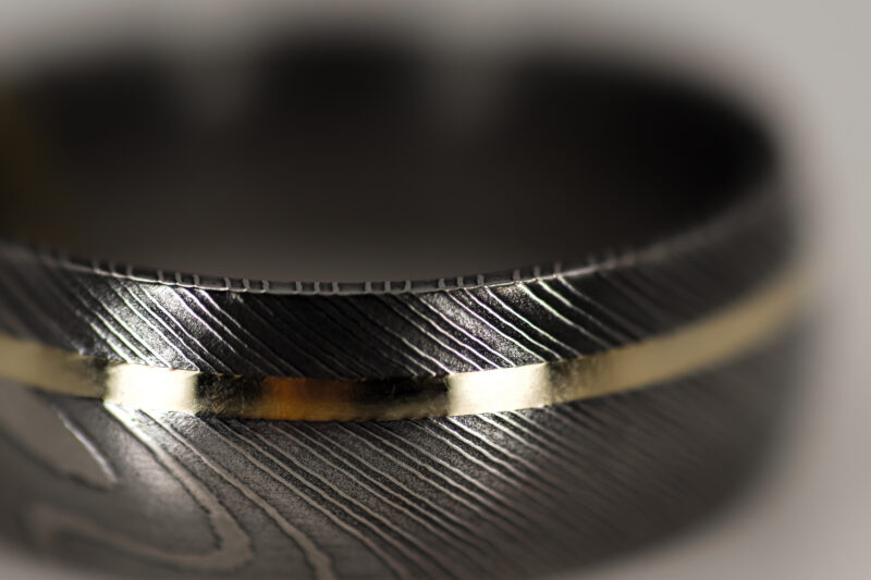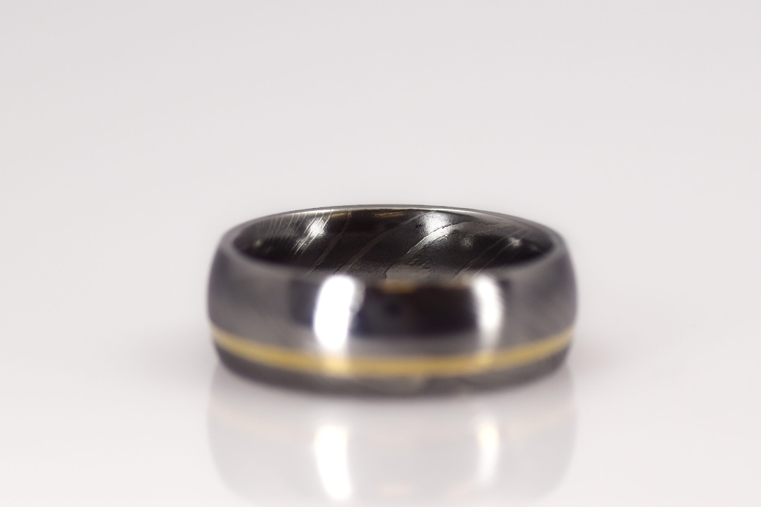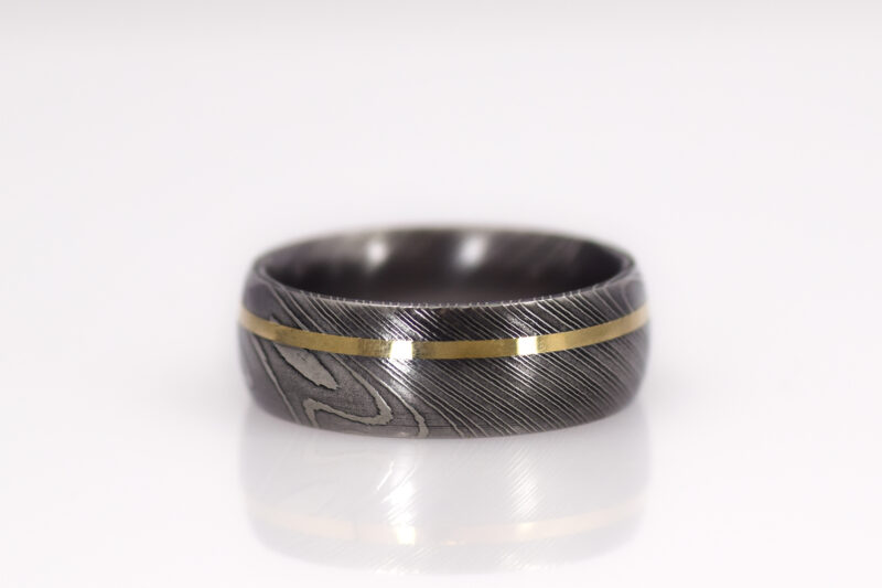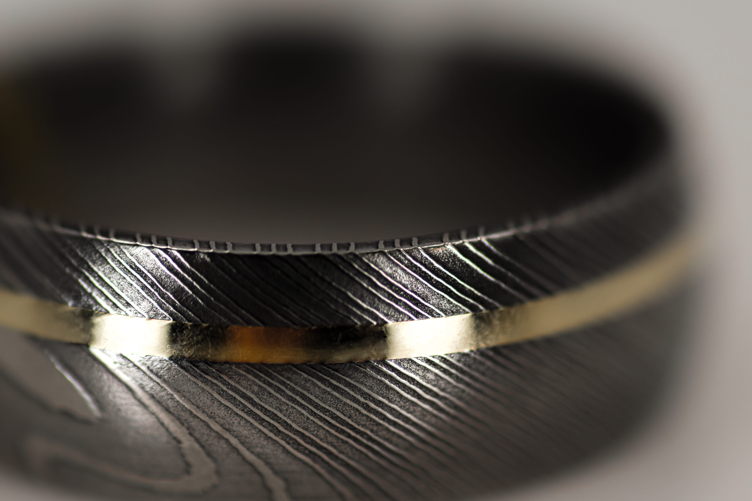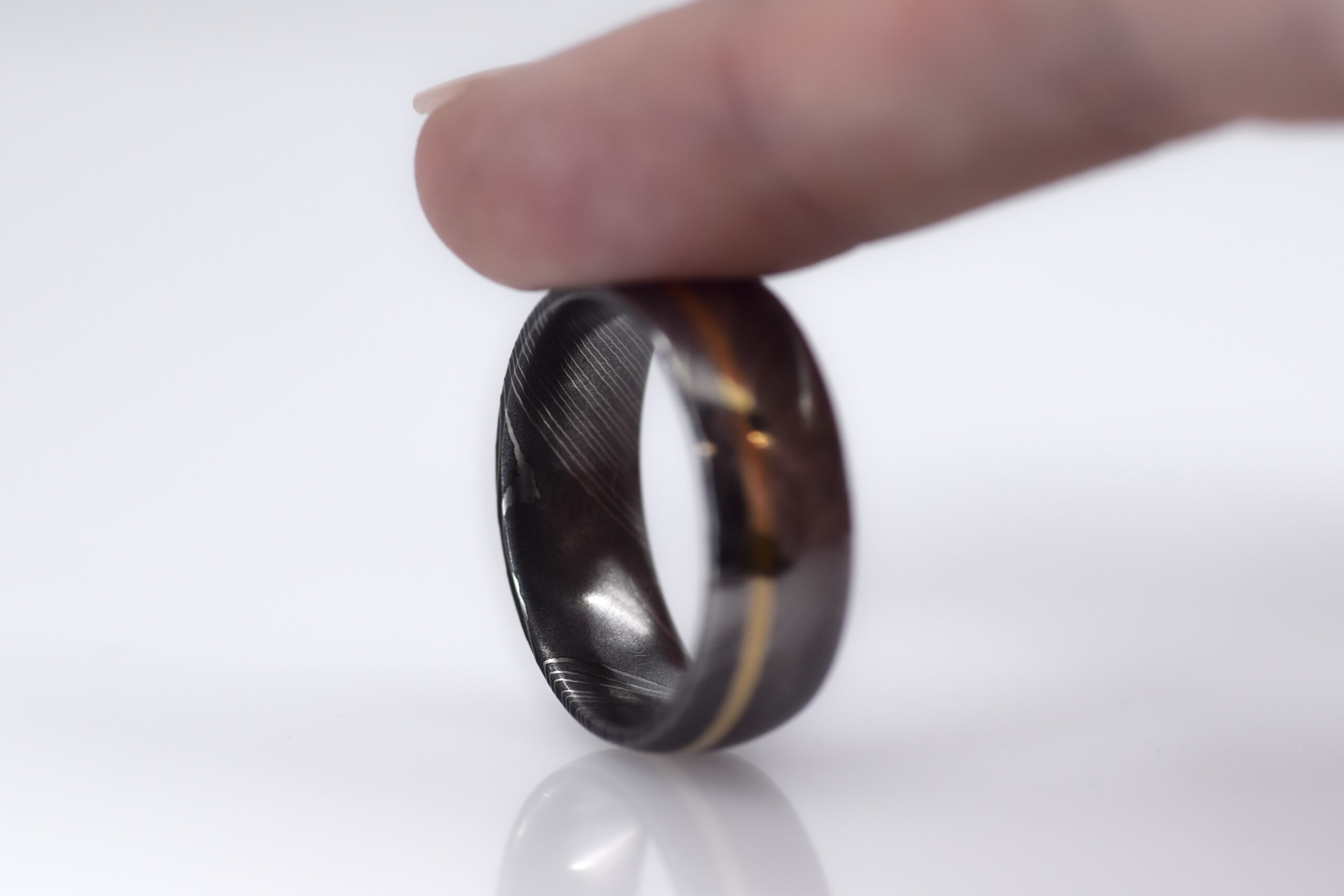 This ring is a modern combination of an ancient art and an ancient custom, combining a simple, gold band with nigh-indestructible pattern-welded steel.
