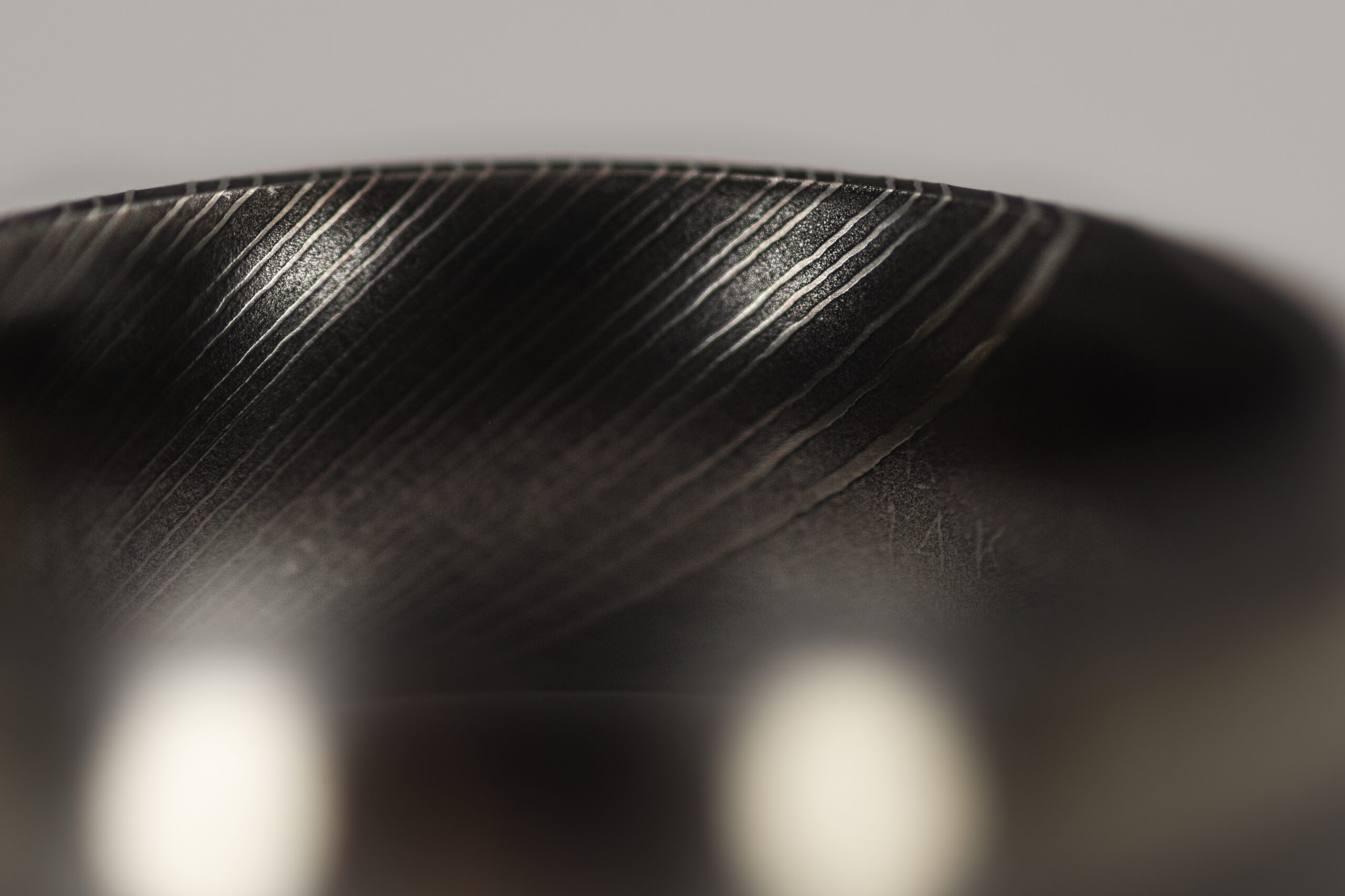 Band: Domed, pattern-welded and acid-etched steel. Gold is inlaid.
