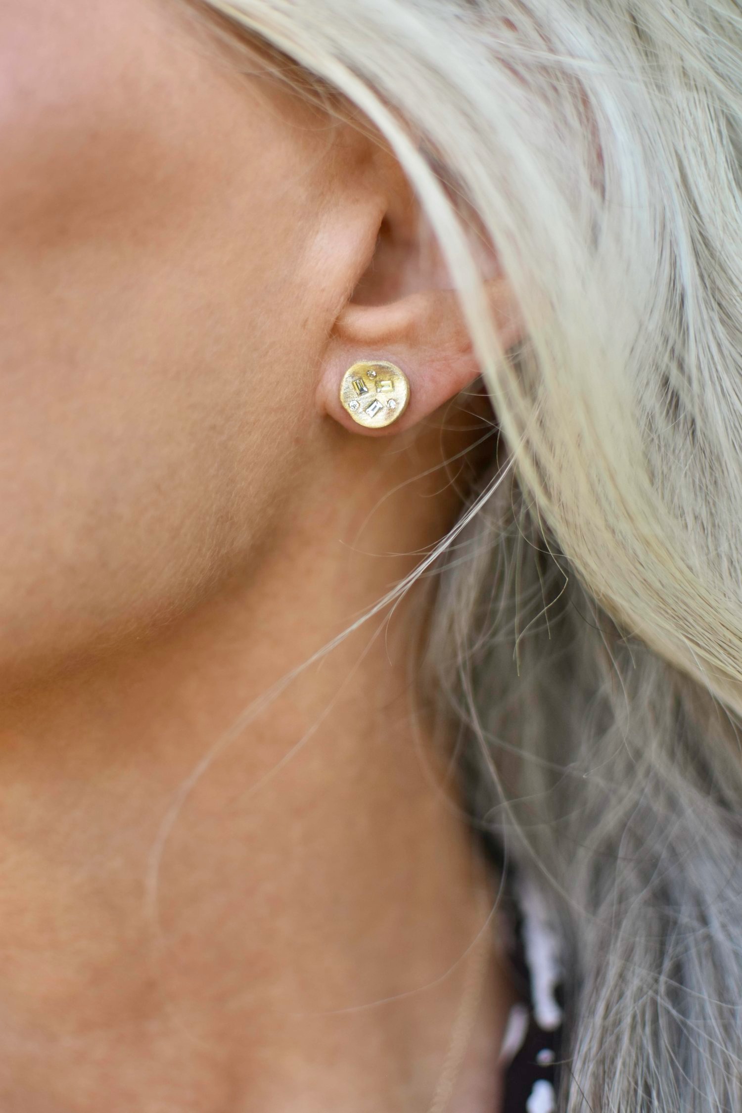 Chunky confetti of round and baguette diamonds scatter, flush-set, across the face of these satin-finished gold disk studs.