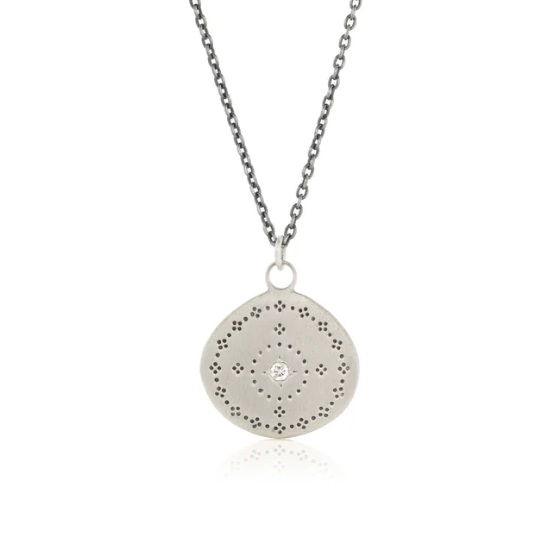 Etched with echoes of the past, this sterling silver pendant carries the soft imprint of memory, delicate Nostalgia impressions that drift across its surface like a faded story. At its center, a single gemstone glows with quiet clarity, anchoring the piece in light and sentiment. Worn close to the heart, it becomes a gentle reminder of moments held and remembered.