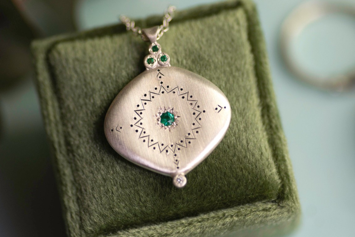 A single gemstone is placed in the center of a beautiful hand engraved design. Four stones are placed across the top and bottom to accent this compass pendant.