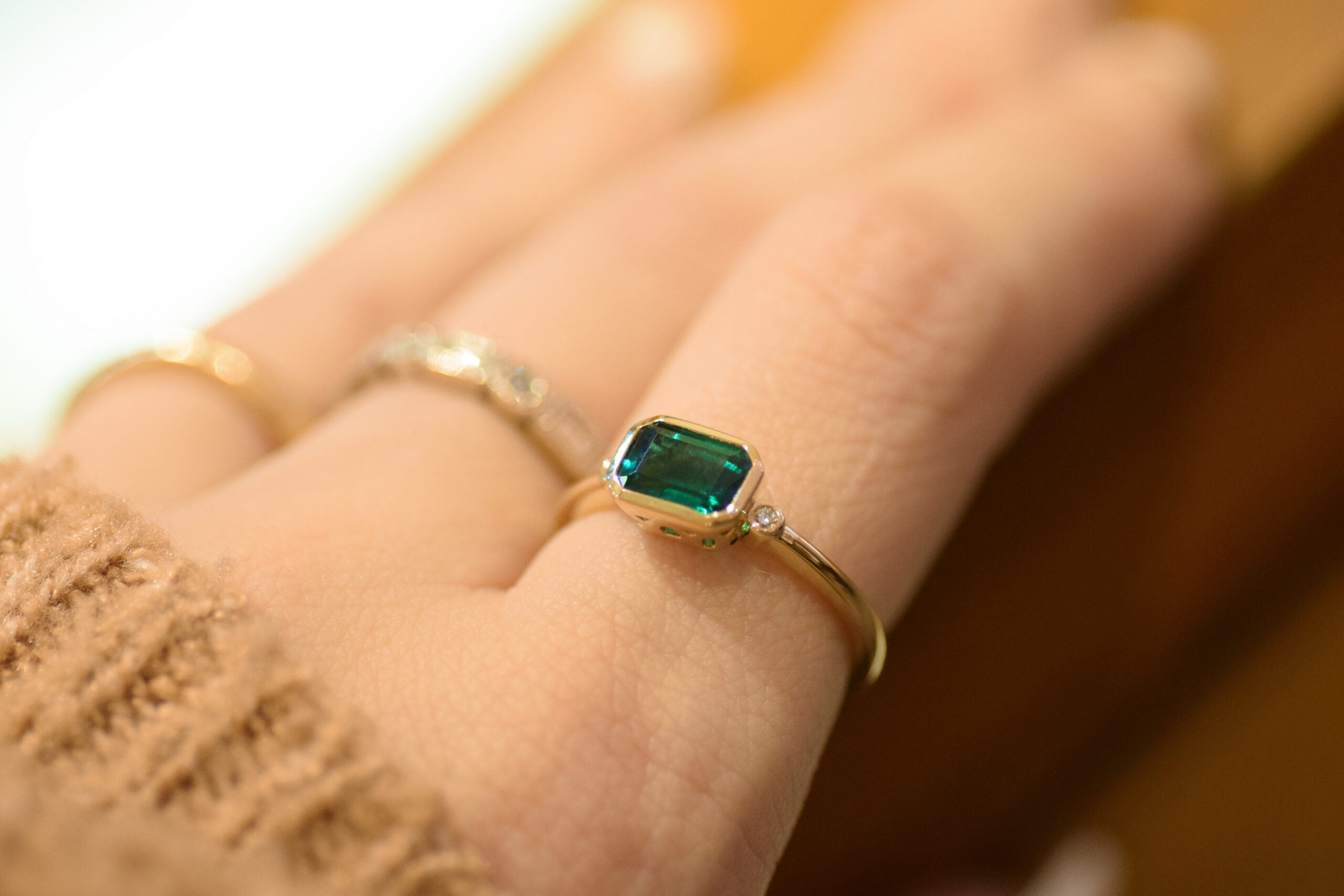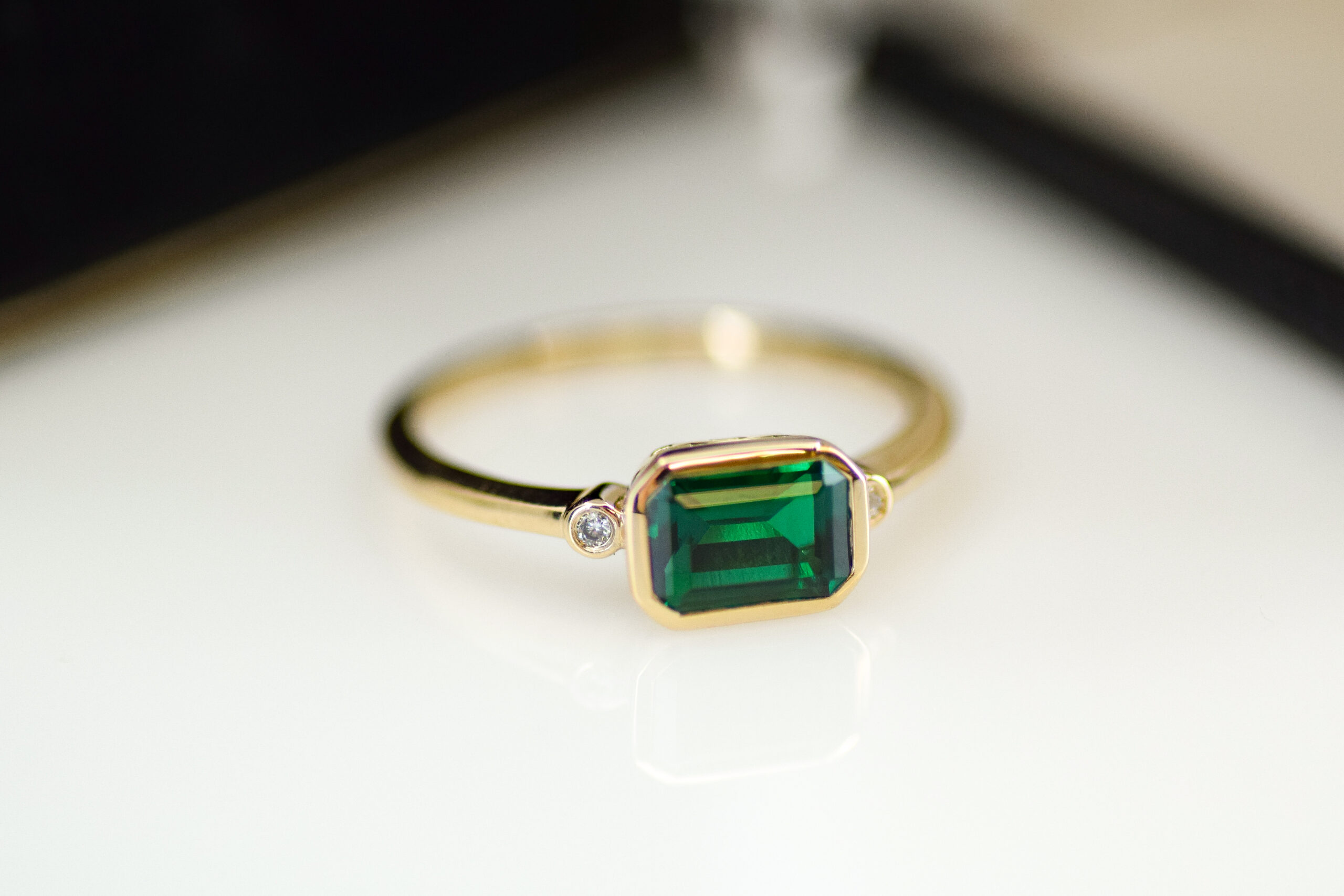 You have all the choice in the world, but you’re confident in your taste. Smooth, gold bezels secure brilliant gemstones: a center emerald and two diamonds commanding either side of the shank.