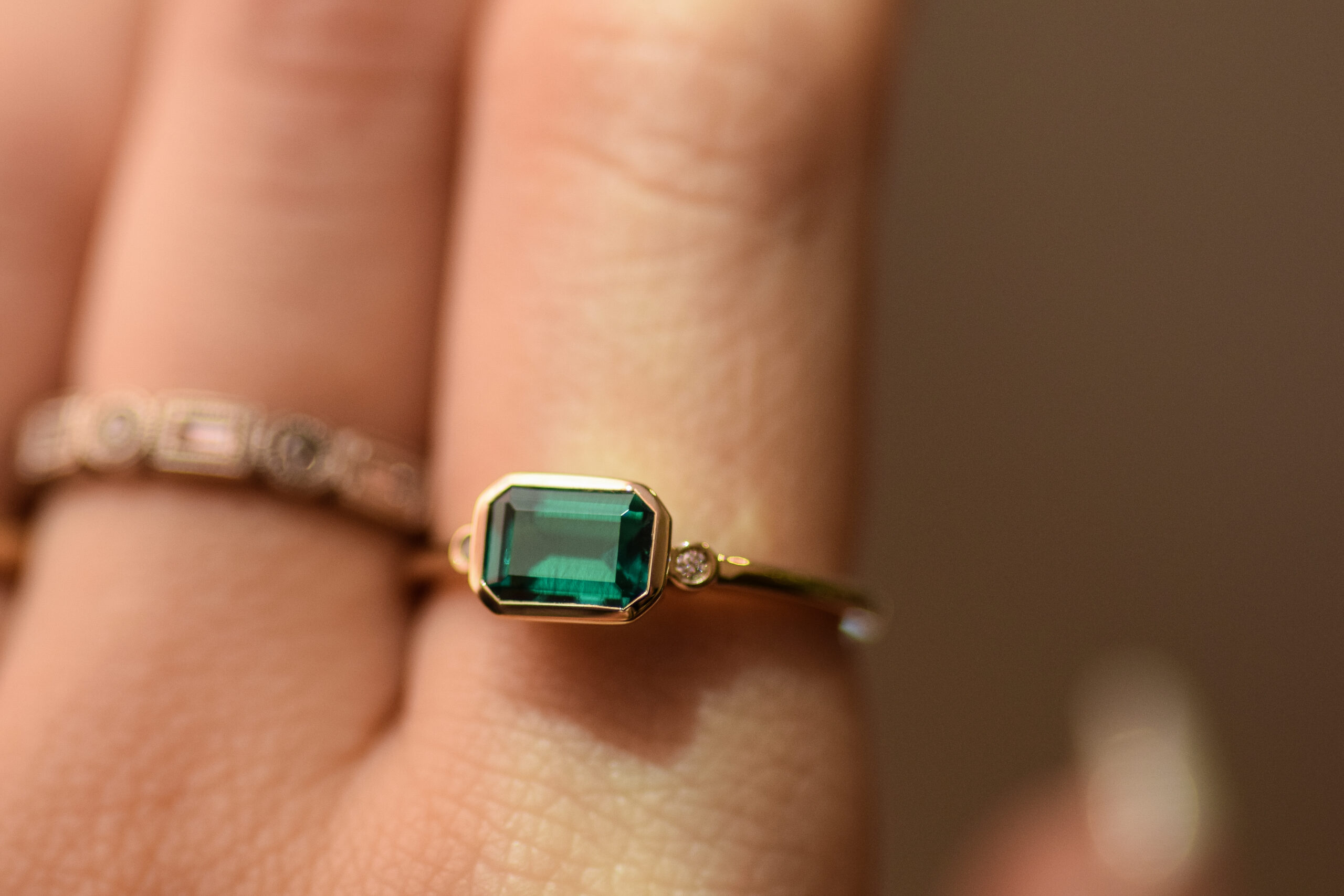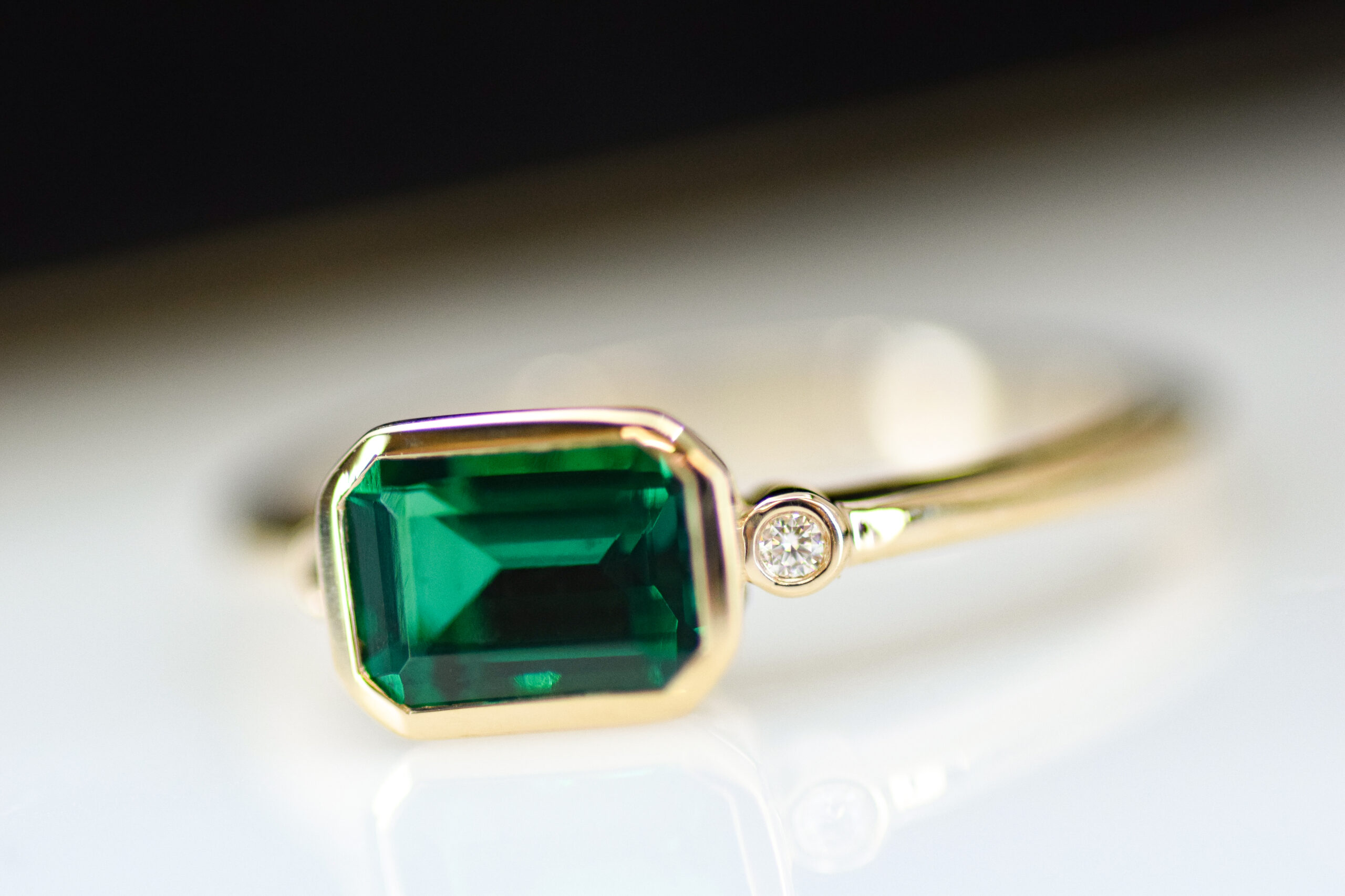 Stone: emerald-cut, lab-grown emerald 6mm x 4mm / round diamond pair 0.02 ctw