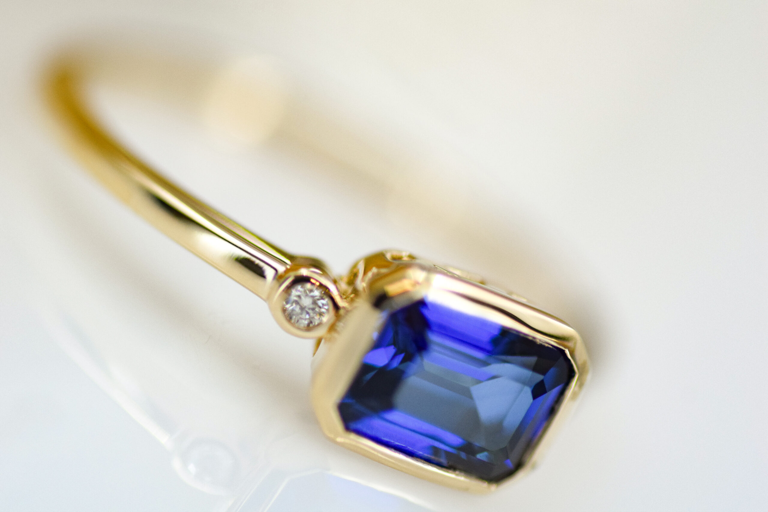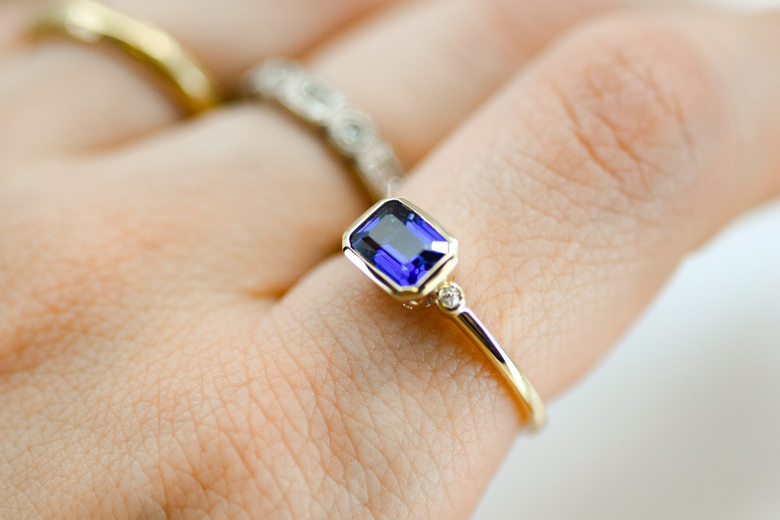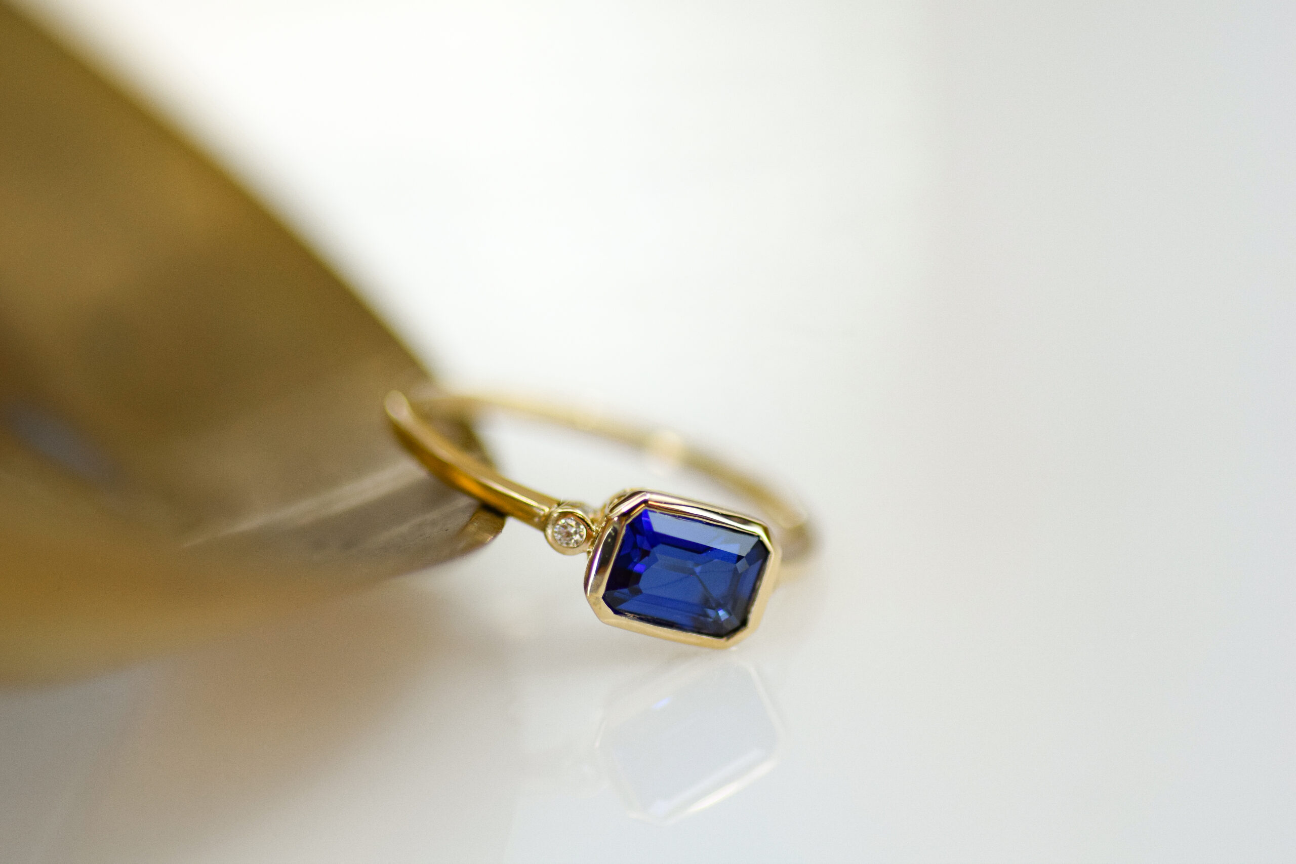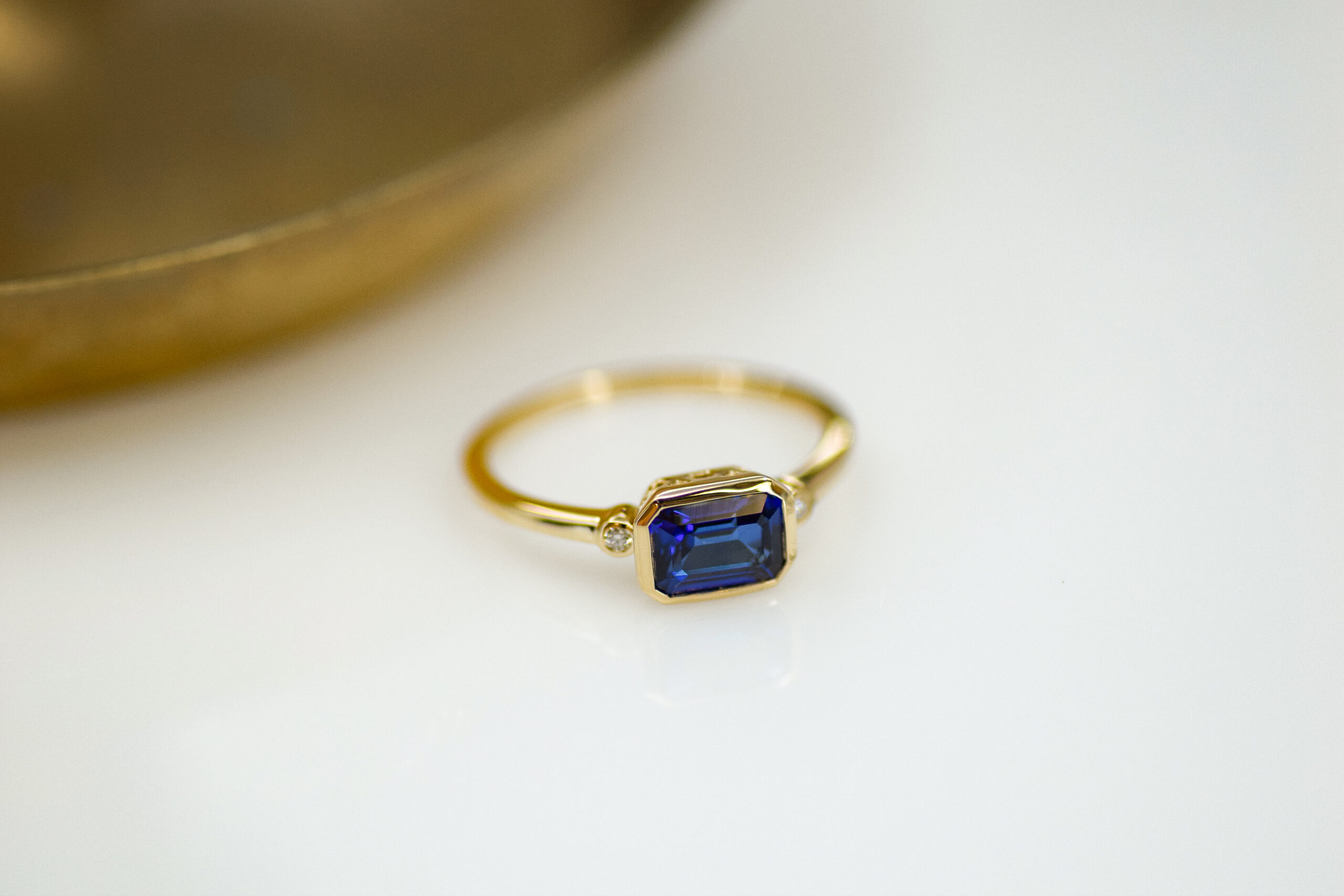 Stone: emerald-cut, lab-grown sapphire 6mm x 4mm / round diamond pair 0.02 ctw