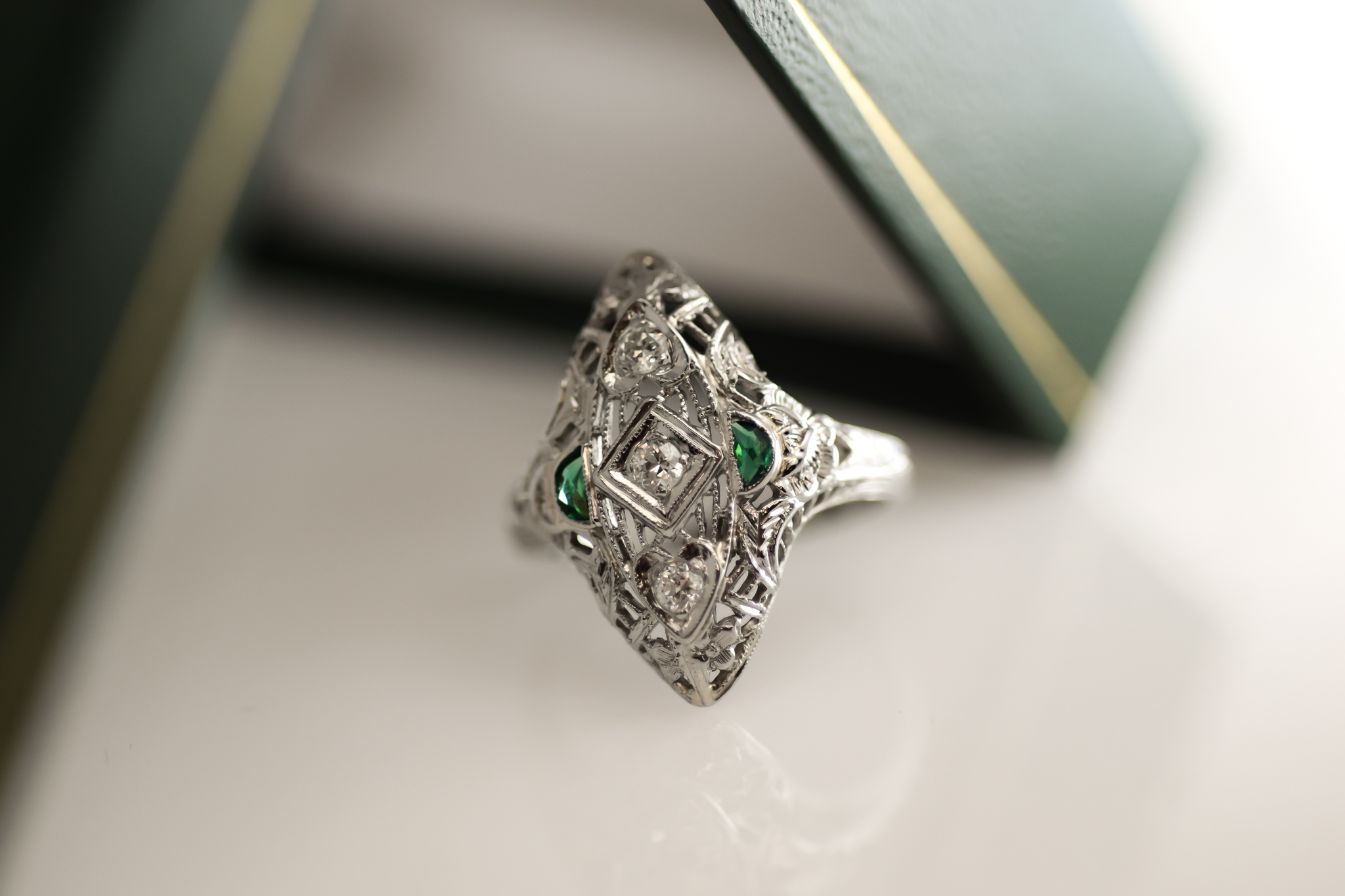 Quintessential to its era, now a testament to time. Shield rings like this emerald piece point to a shifting of sentiments from the naturalistic Art Nouveau movement towards architectural Art Deco, at once capturing both.
