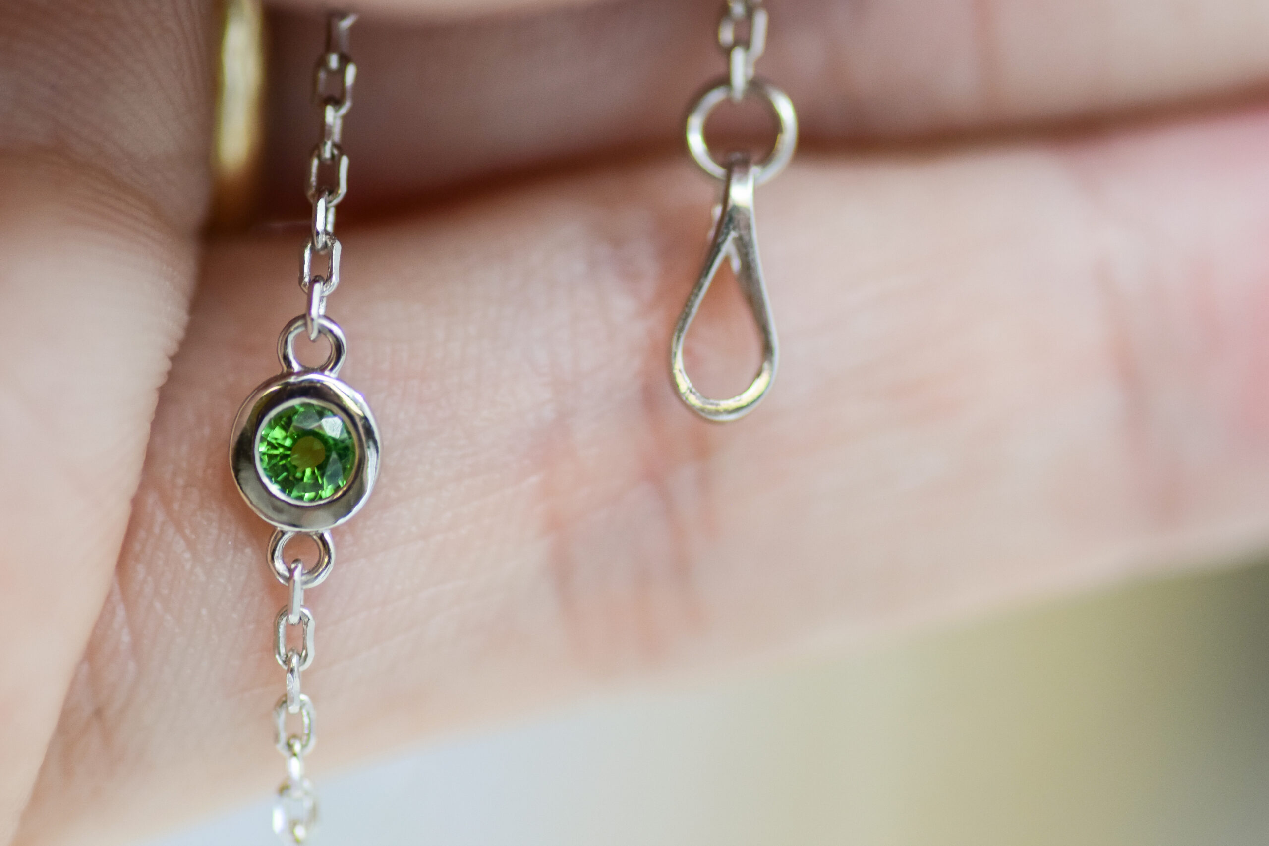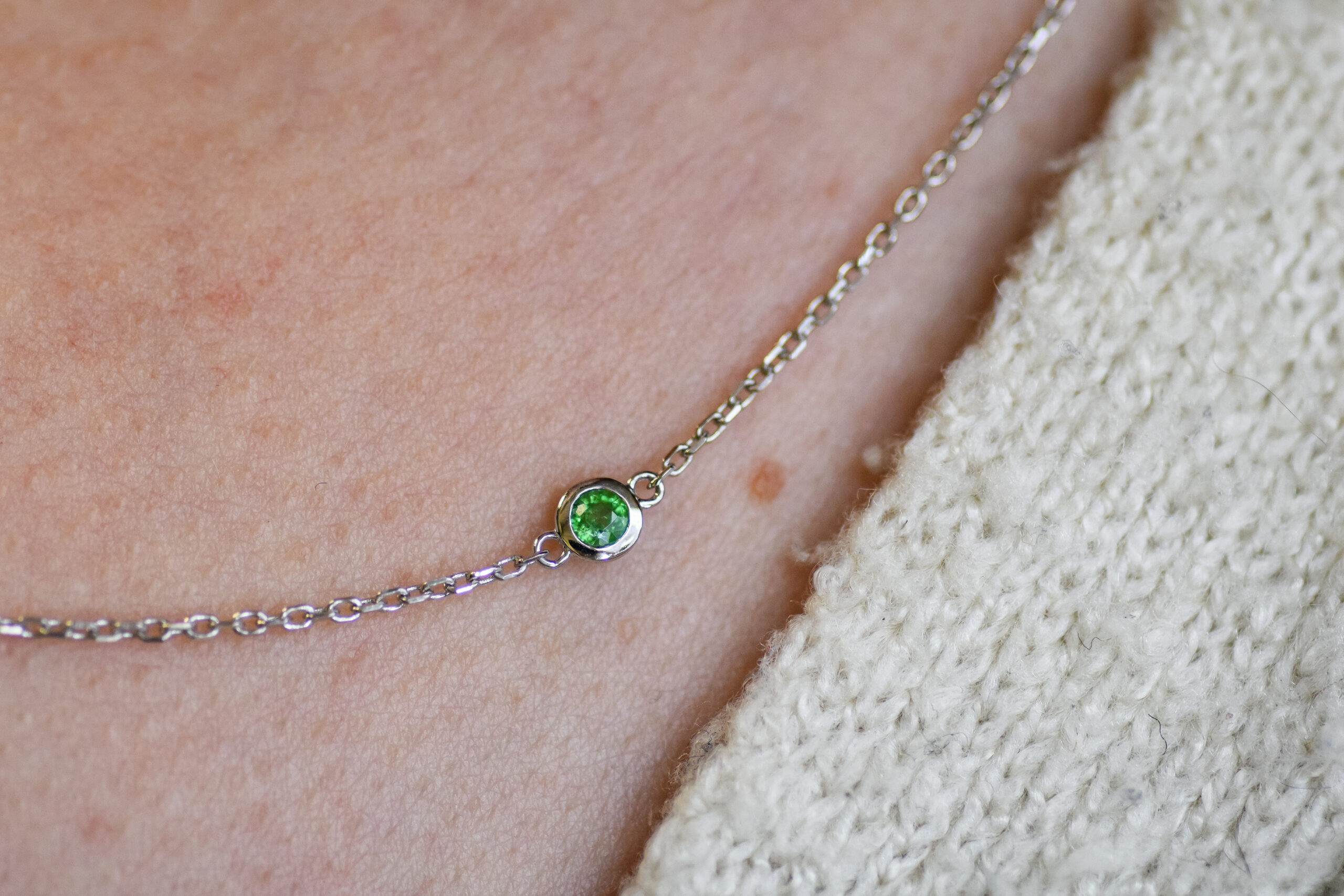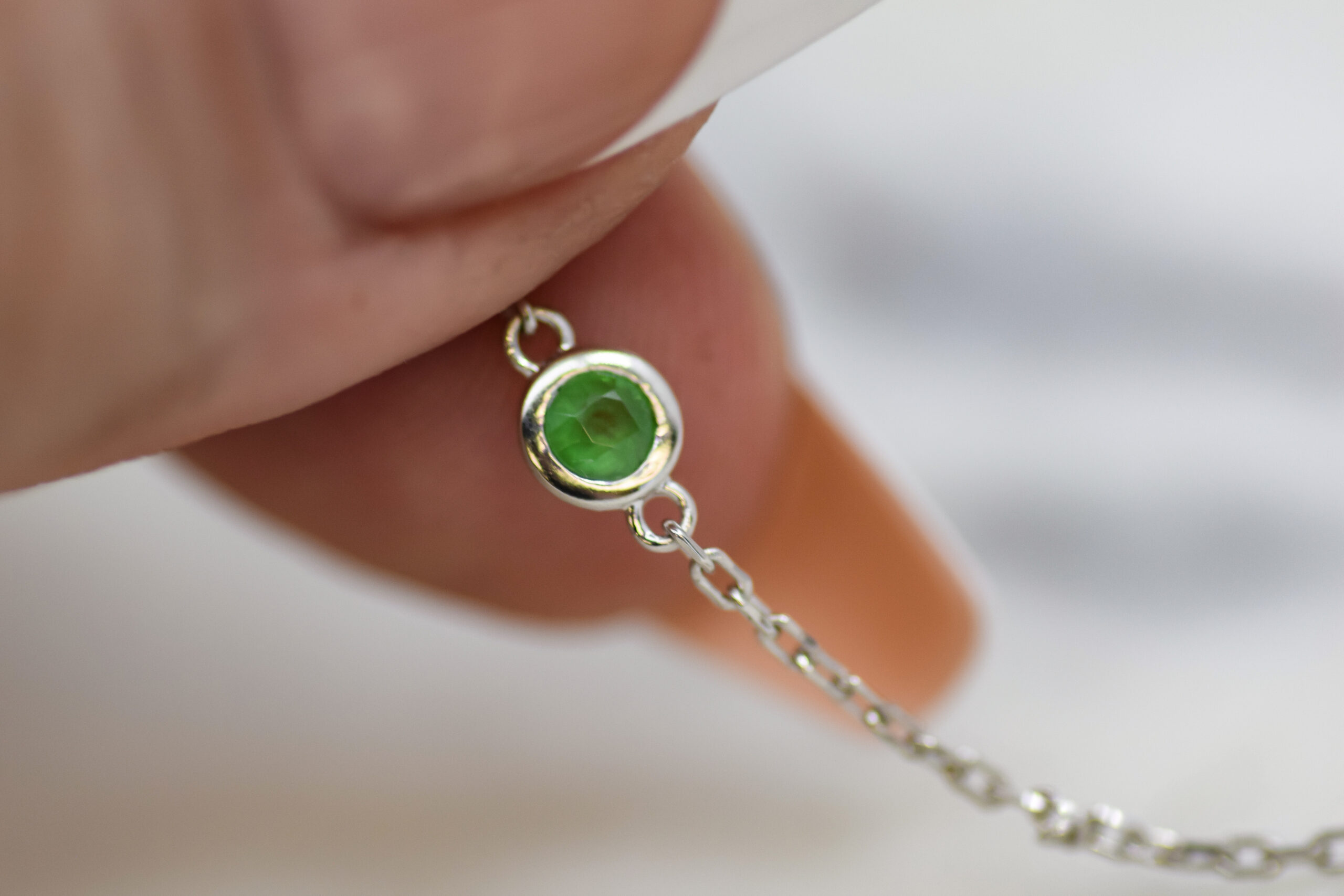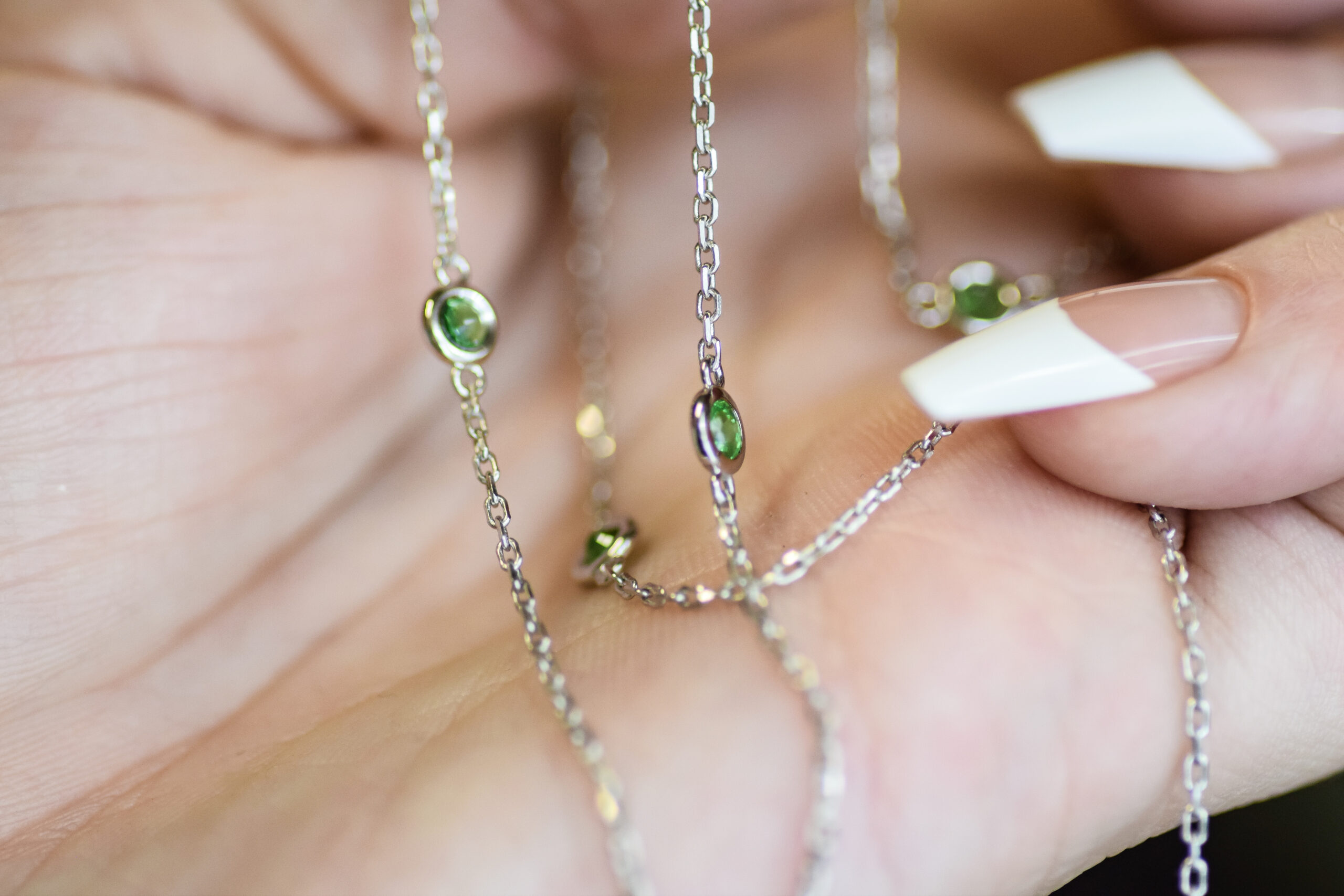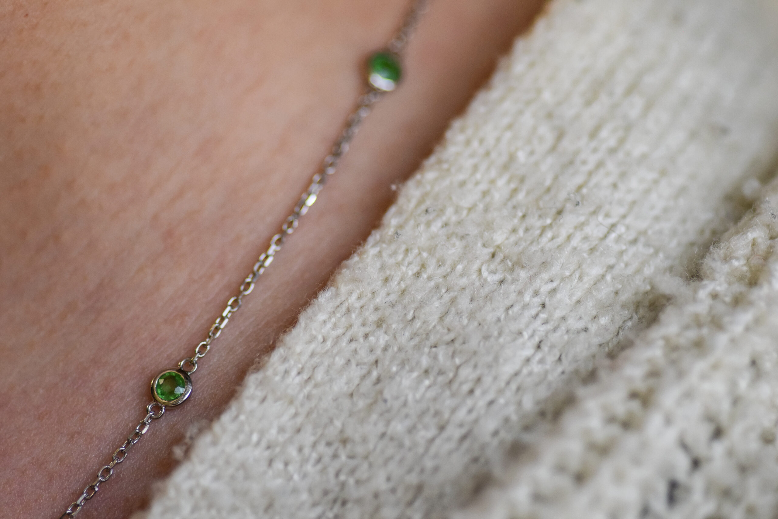 An obvious choice for fans of quiet luxury; bezel-framed tsavorite garnets let peeks of light illuminate their delicate colors.