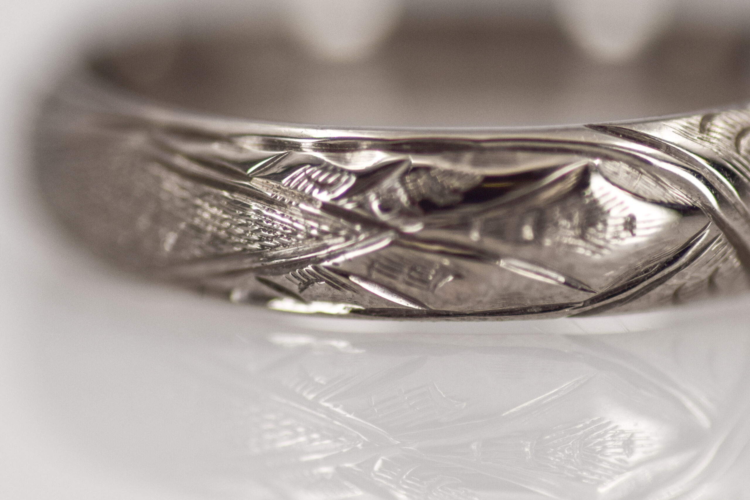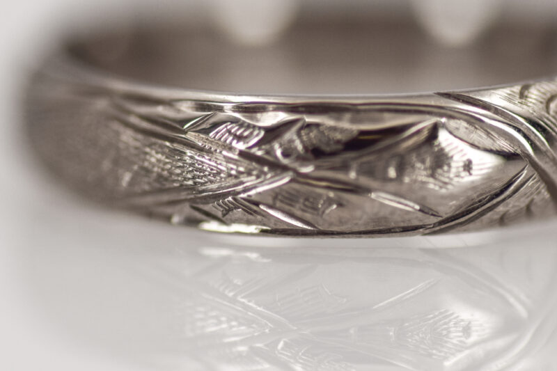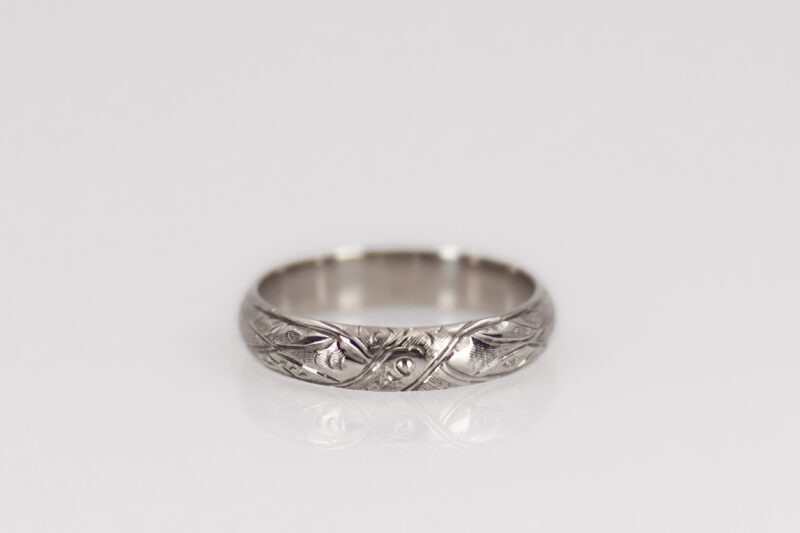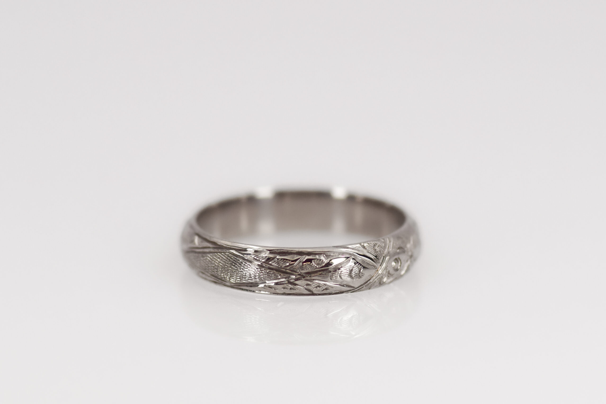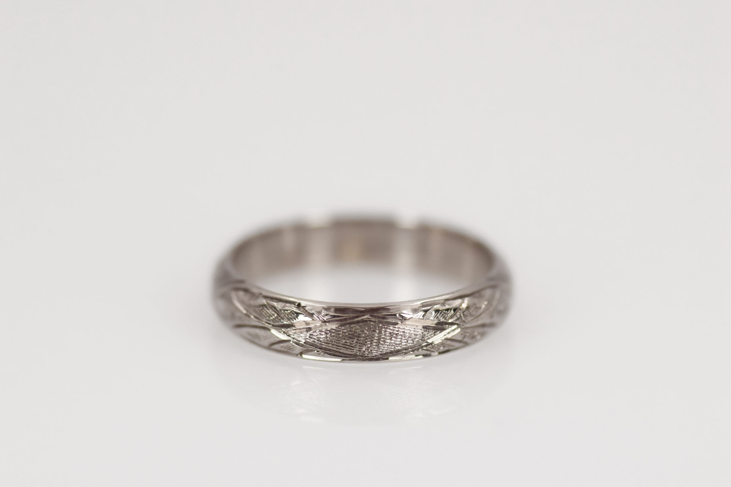 14k white gold domed band engraved with scrollwork, crosshatching, and sections of stippling. Classic “unisex” proportions.