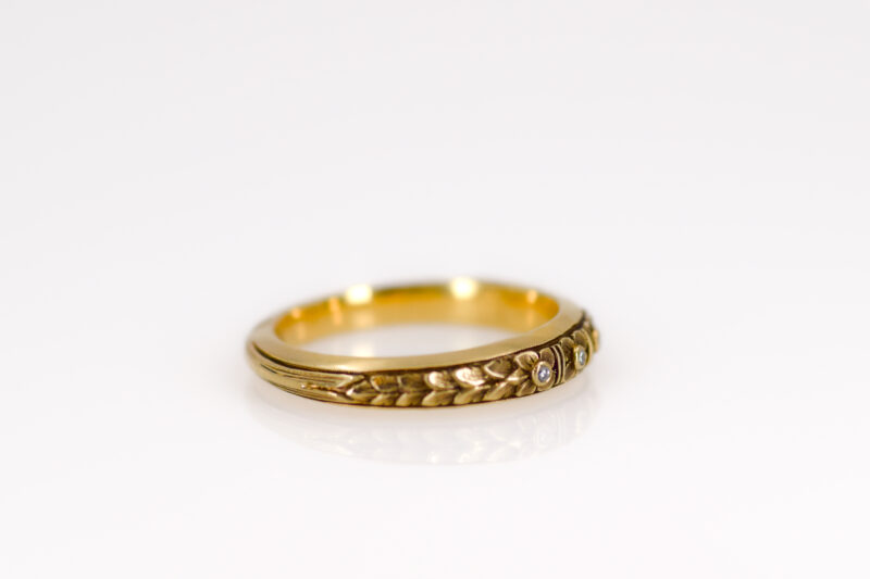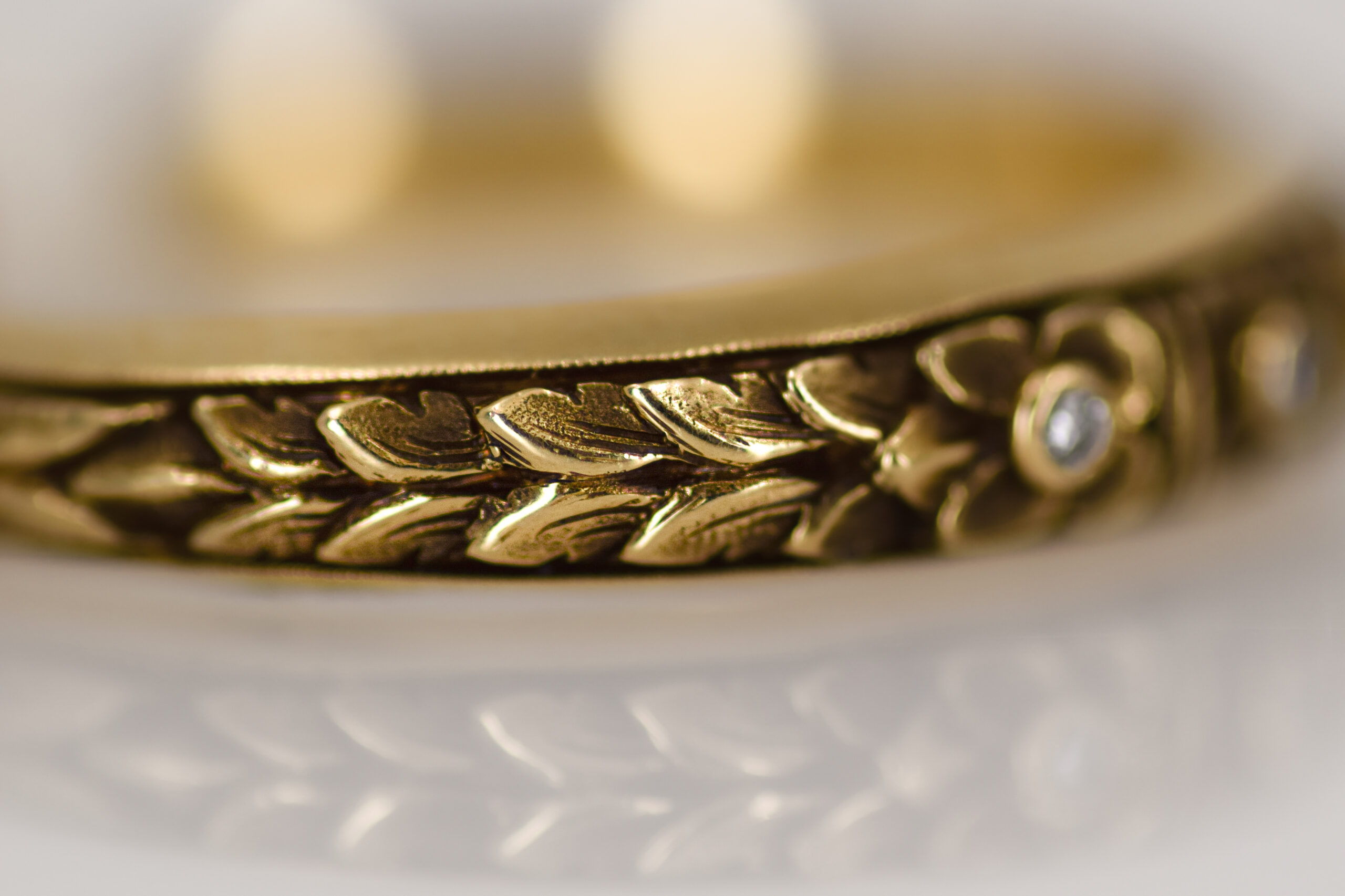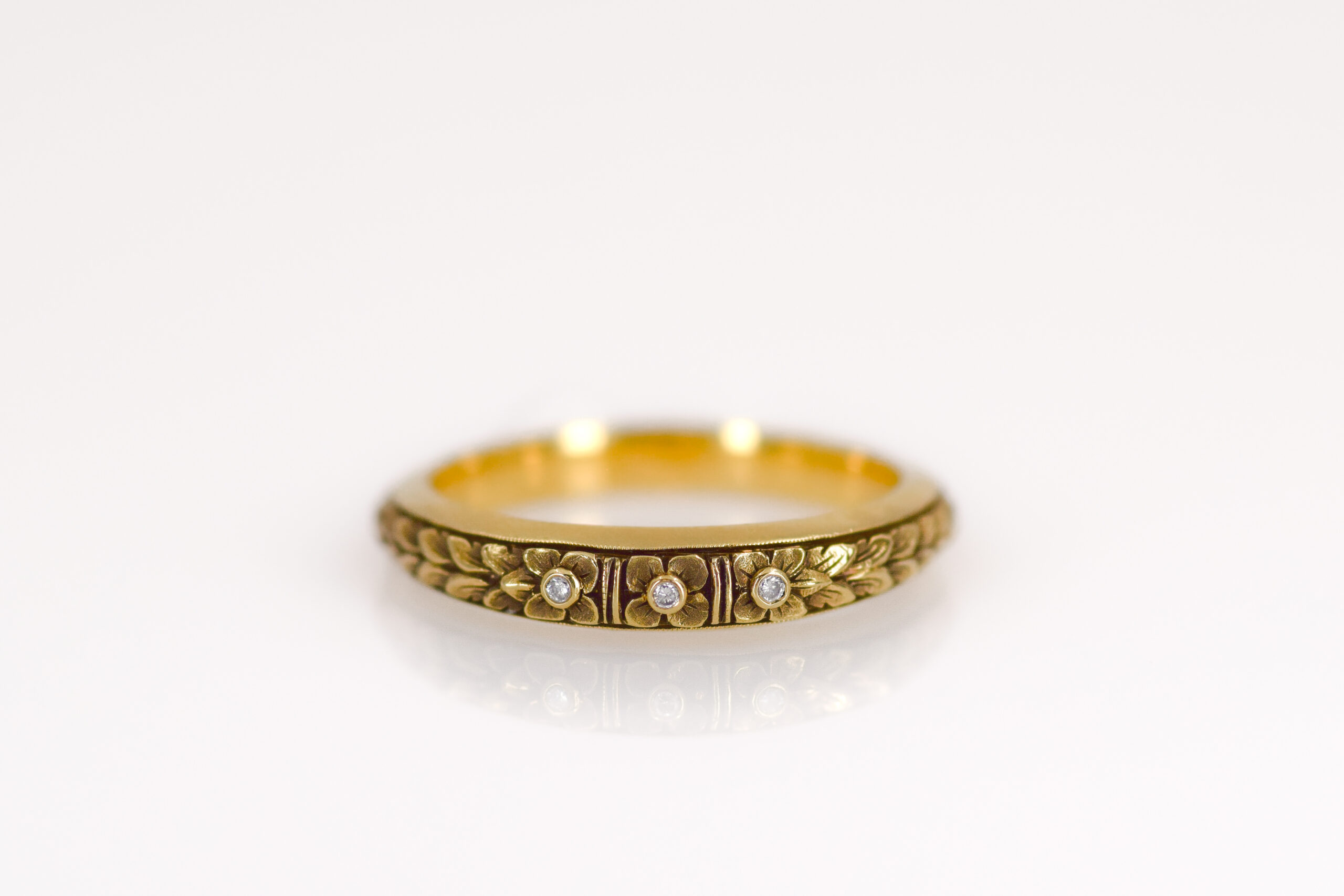 Band: Domed, engraved with a trio of evening primroses, centers set with diamonds, with simple leaves to halfway down the band.