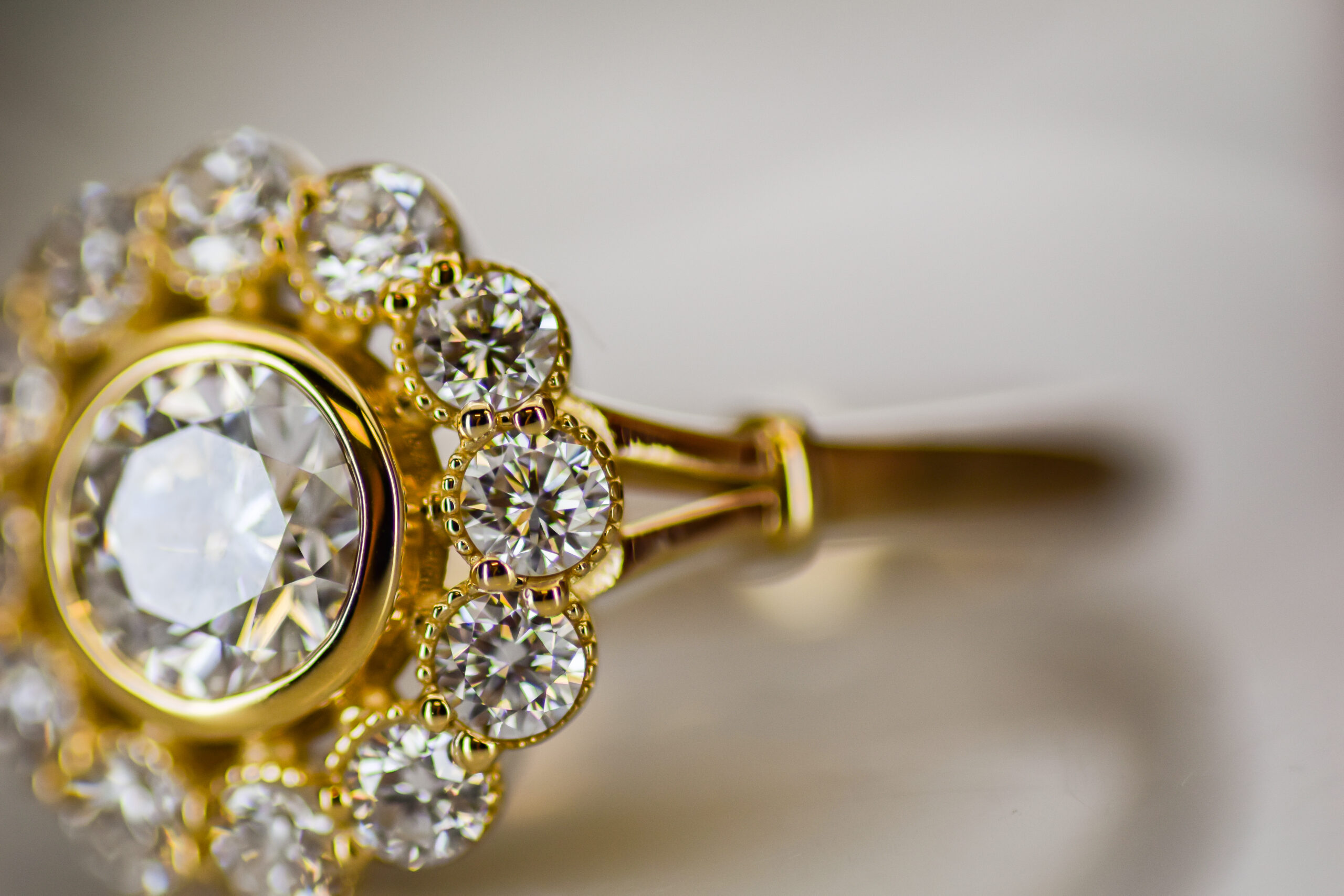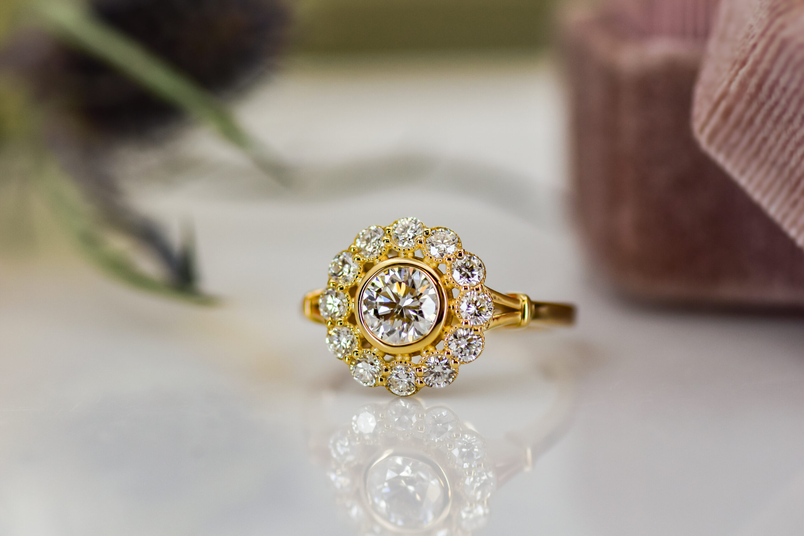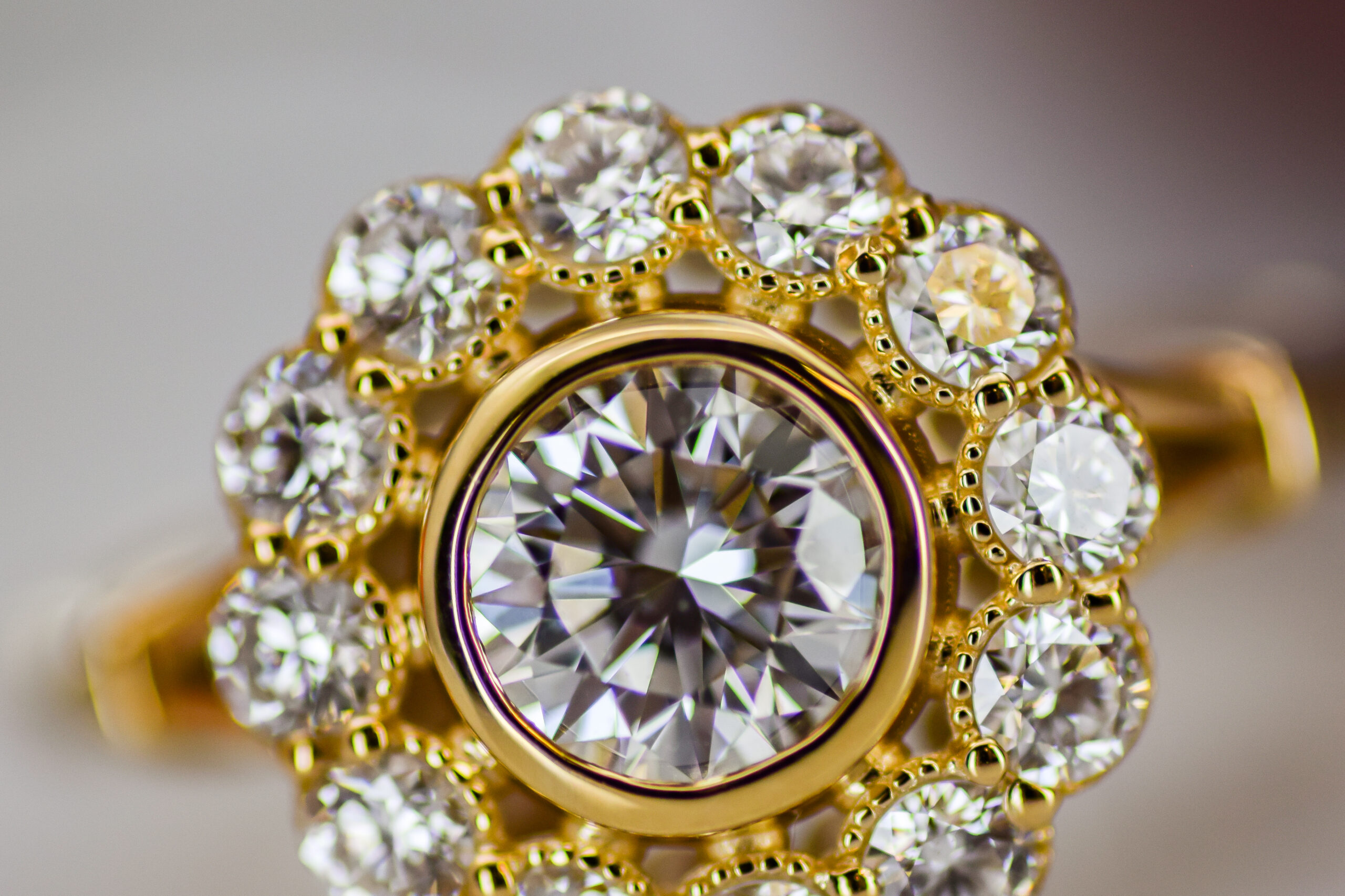 There’s something delightfully Art Deco about repeated shapes. The circle, symbol of eternity, is repeated like petals around a central diamond that time will never wilt.