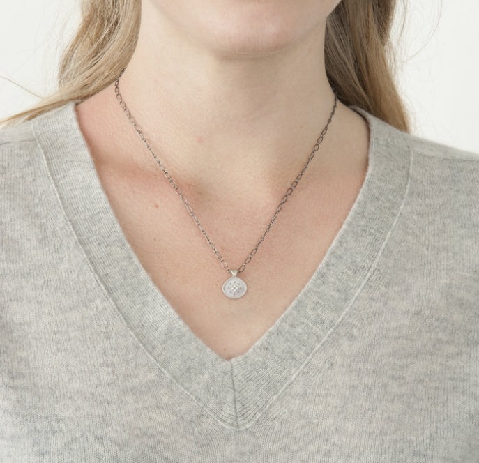 This sterling silver pendant captures quiet beauty, each hand-set gemstone shimmering with unique glow. Delicate Nostalgia etching traces soft, vintage-inspired patterns across the surface, whispering stories of the past, it holds a luminous world of color, light, and timeless grace.