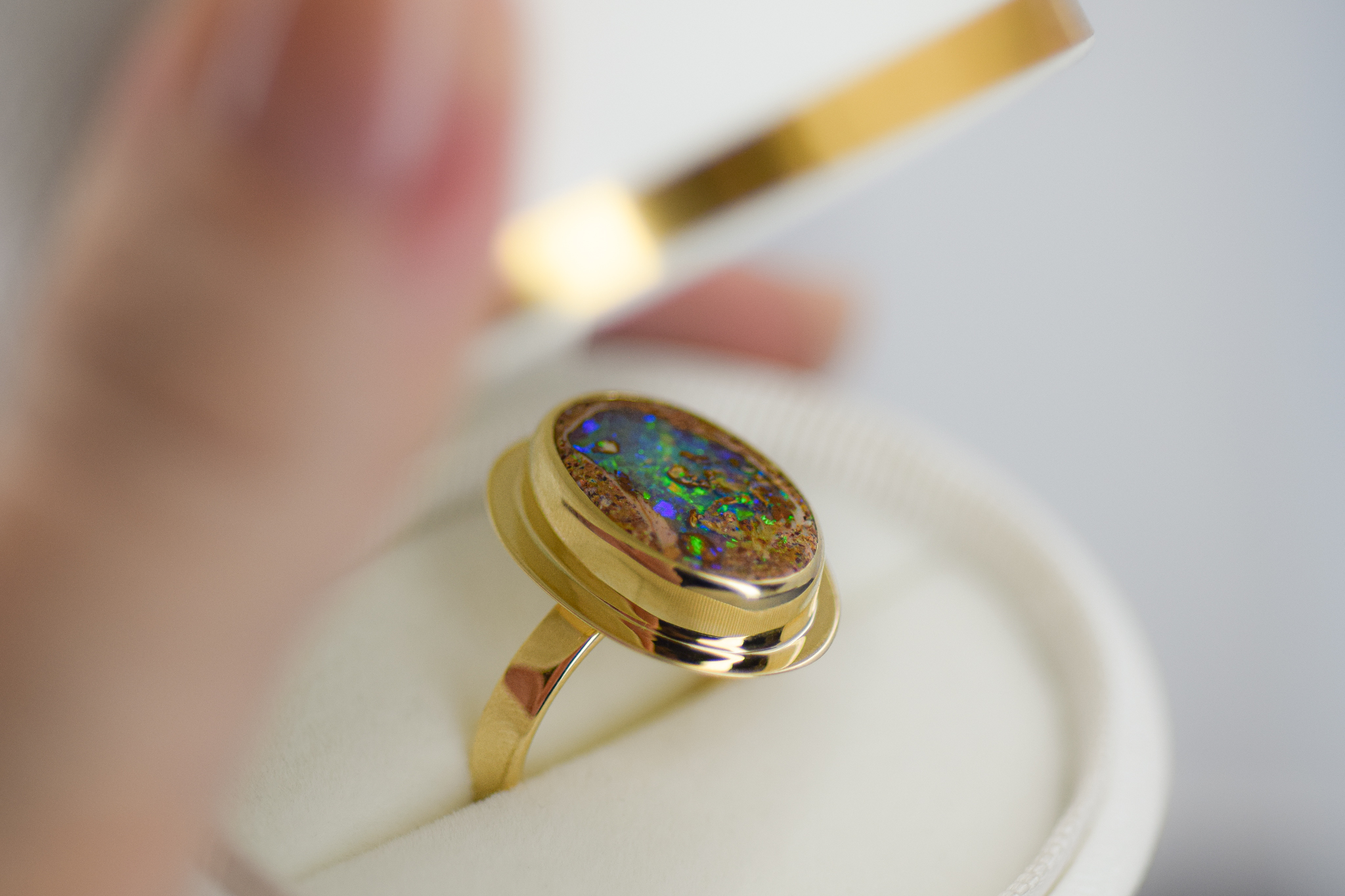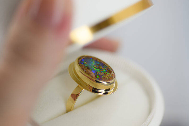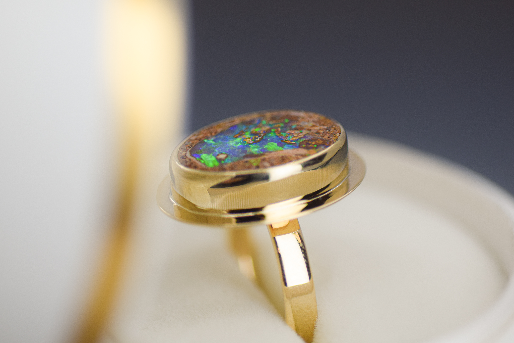 Australian opal matrixed in wood, bezel-set, with incredible color flash. Shows intense, bright greens through to iridescent purples. 14k yellow gold band and setting. Size 7.