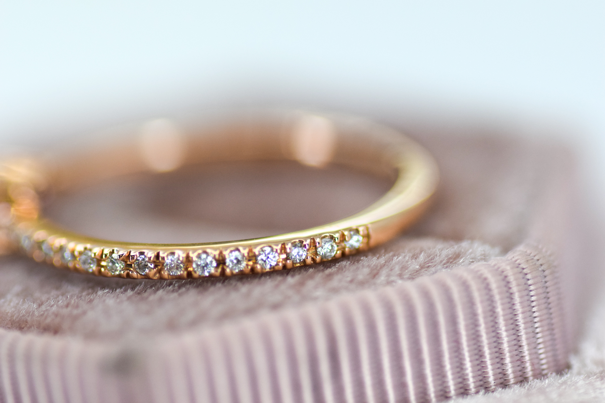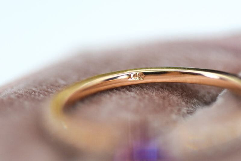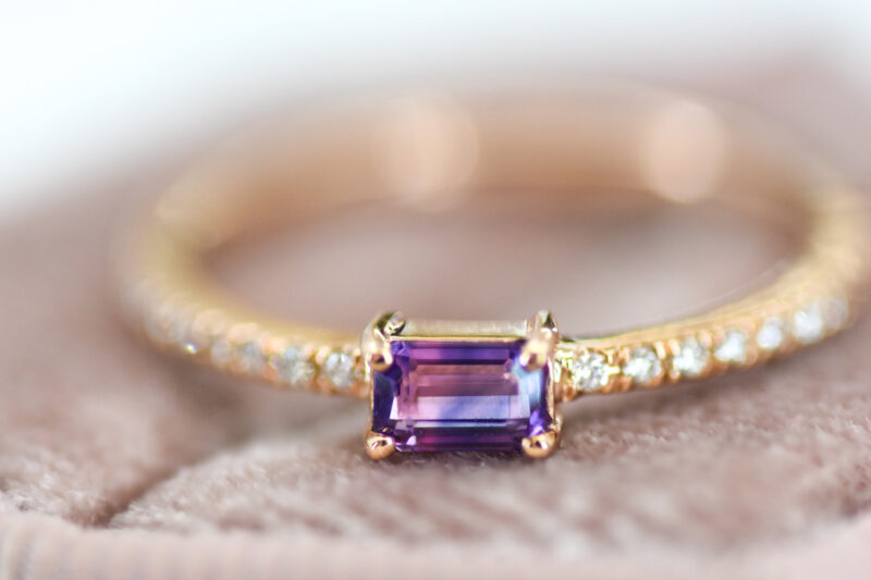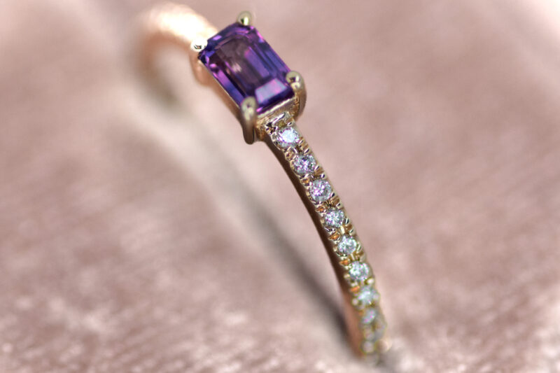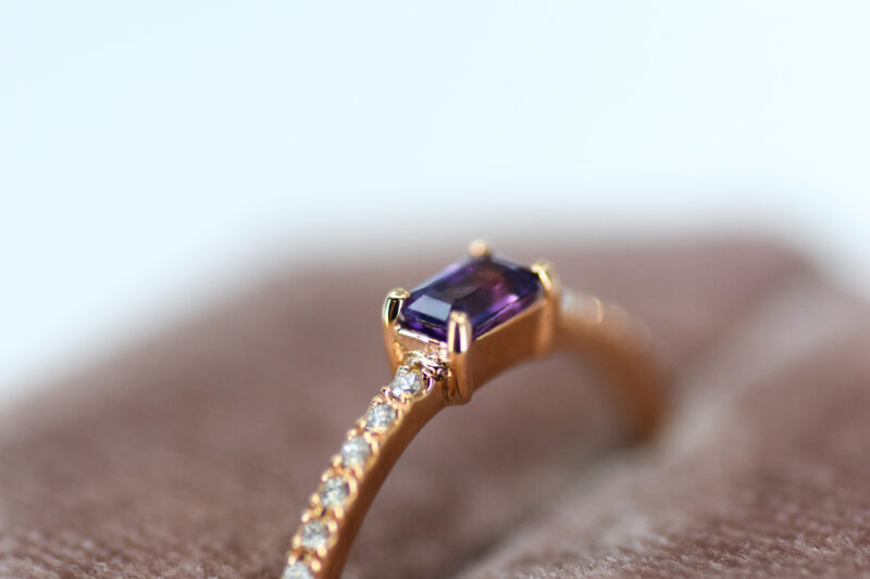 This gorgeous pink-purple sapphire dazzles in the center of this diamond-encrusted band. Dainty but show-stopping, this ring is a perfect add to your everyday jewels.