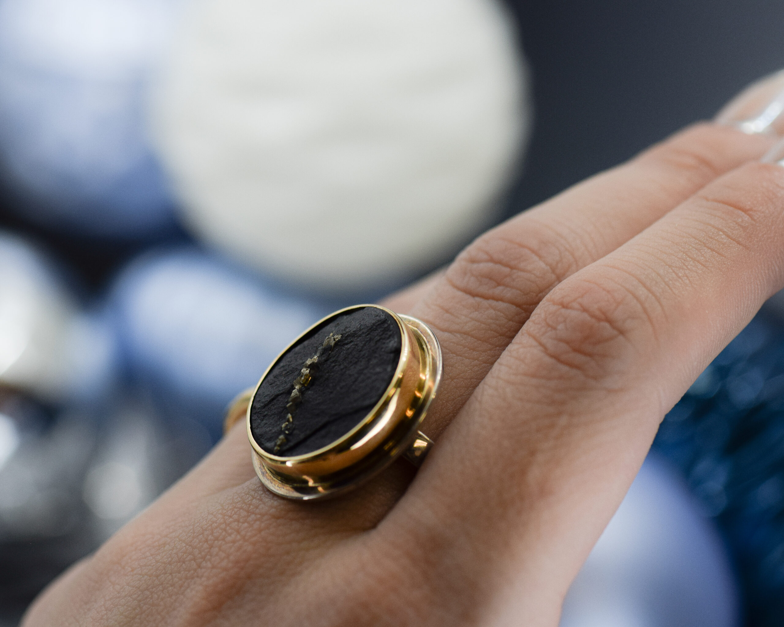 Natural pyrite crystals in schist stone. 14k yellow gold bezel setting and Sterling silver band.