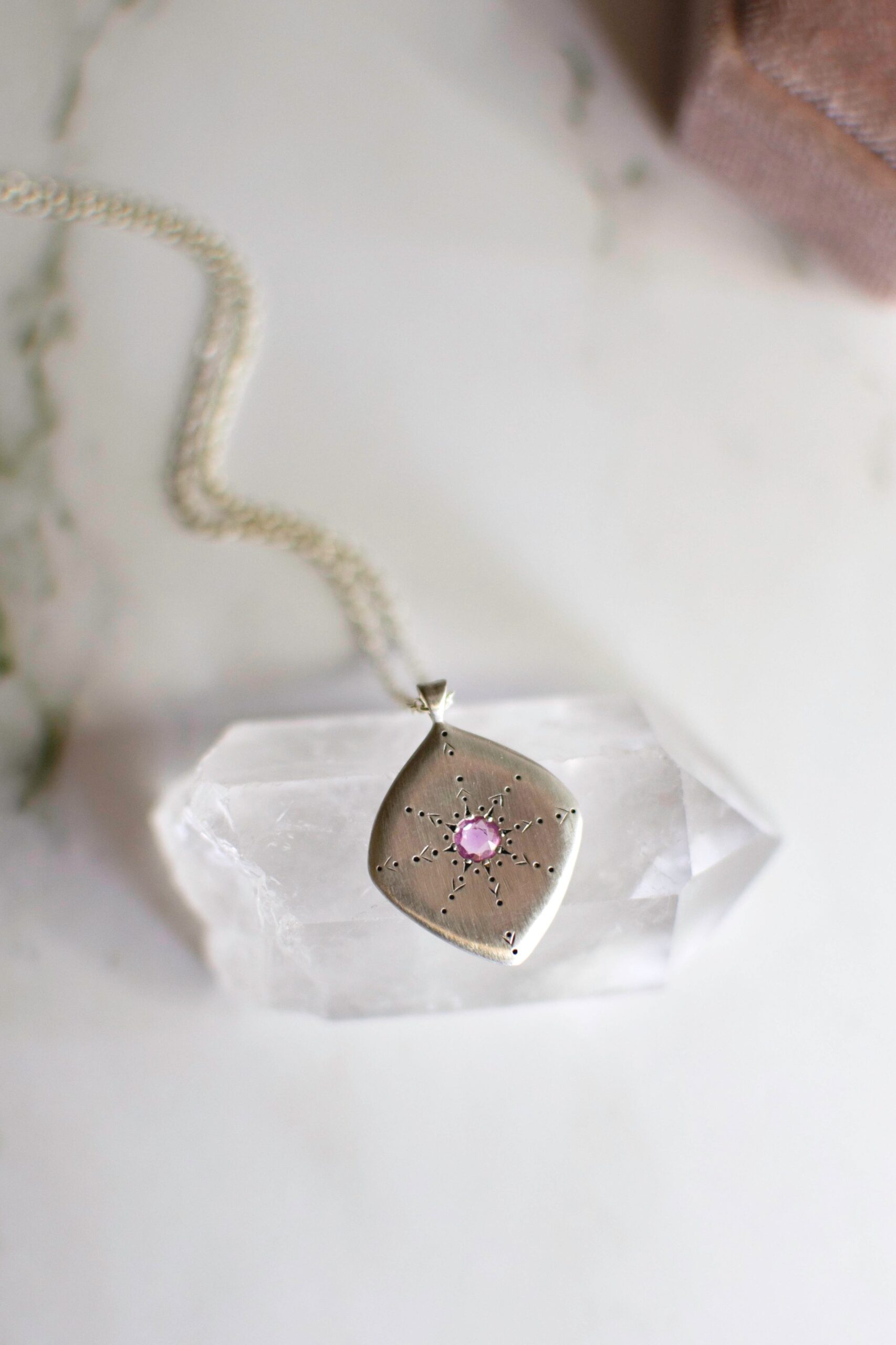 Adel Chefridi “Star Gaze” pendant with a (rose-cut pink sapphire), hand-set and engraved in brushed sterling silver. Chain adjustable 16-18″ .