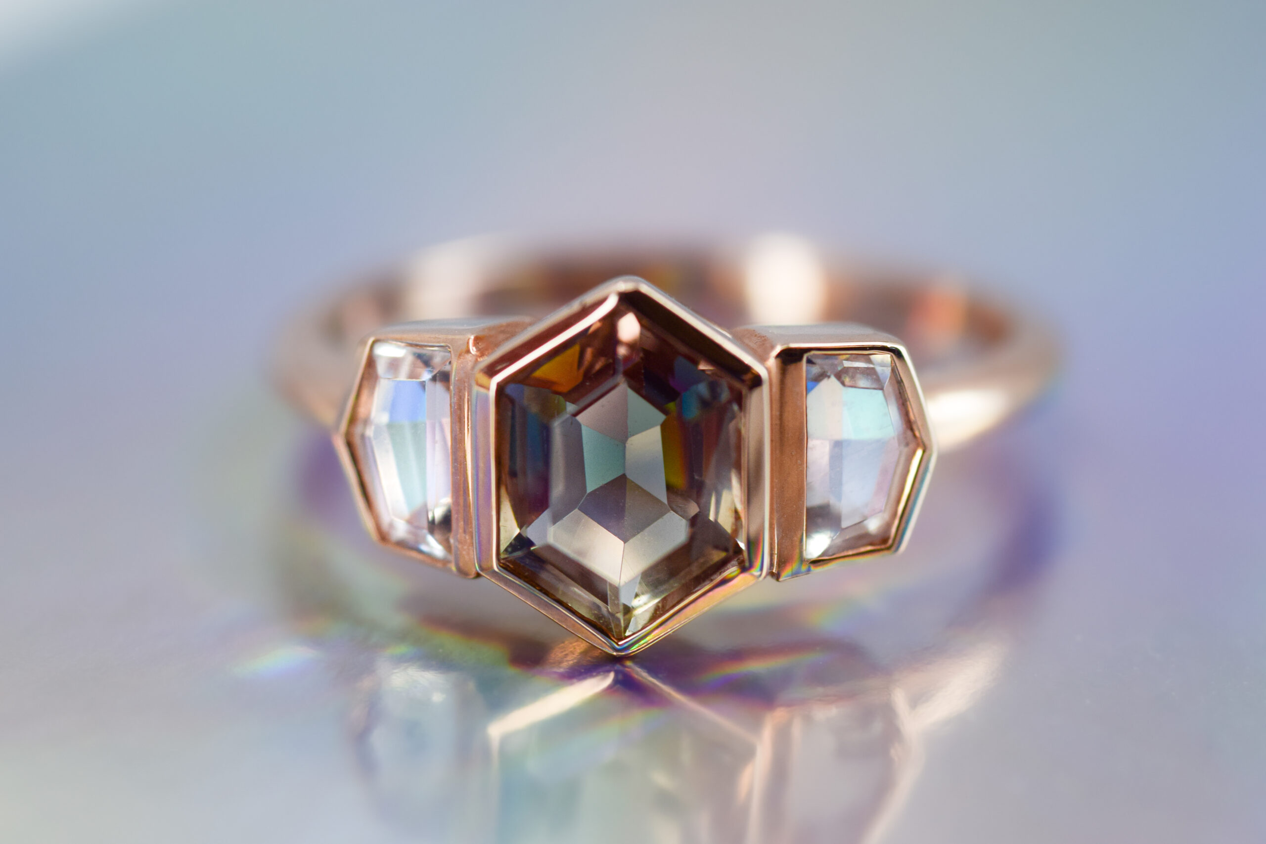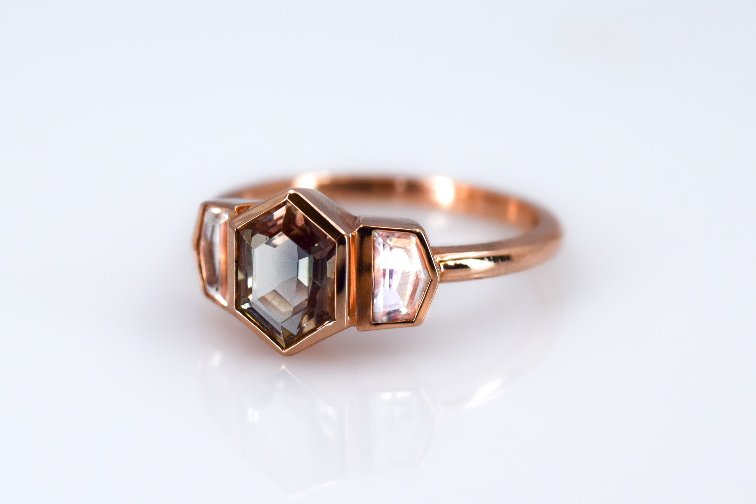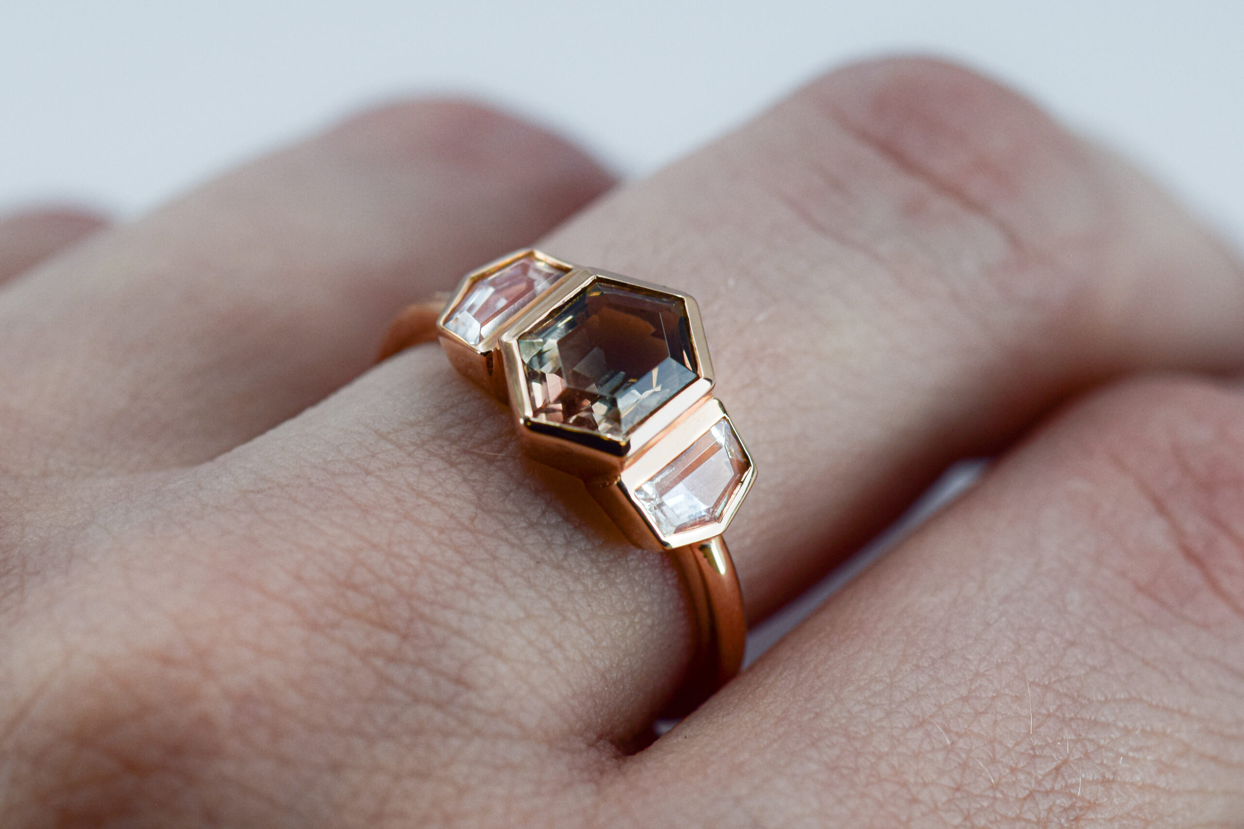Where does the sun meet the moon? Here at The Jewelbox in Ithaca, NY, where this natural sunstone nestles between two sweet moonstones – all set in 14k rose gold!