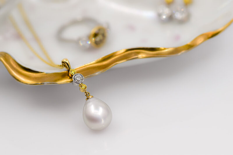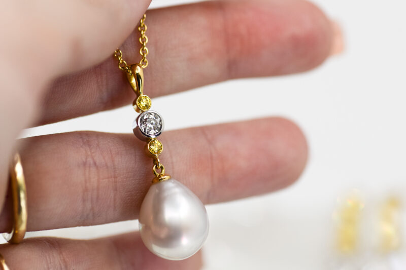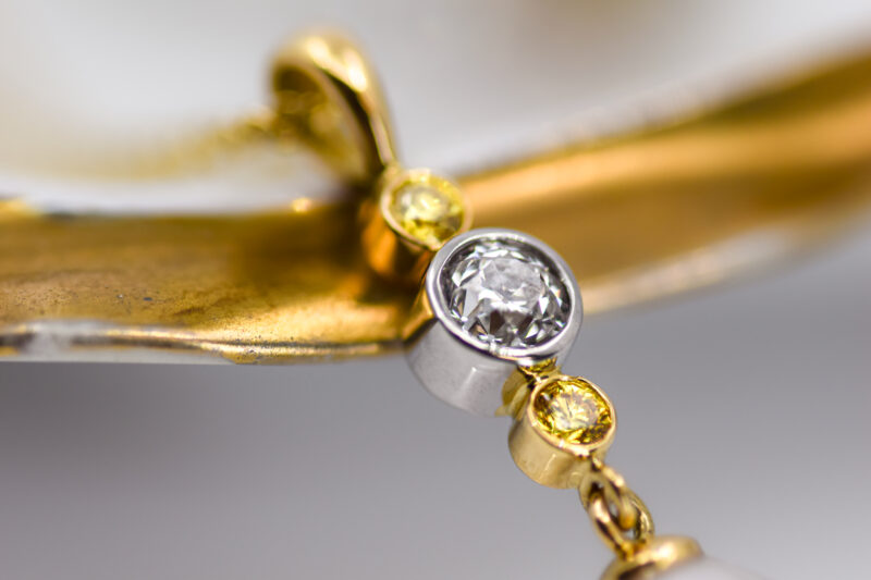 A marvel of formations. Yellow diamonds flank a large, white diamond, and a gorgeous pearl drops from the trio. Pearls take anywhere from a few months to a couple years to form–while natural diamonds take anywhere from 1 to 3.3 billions years.