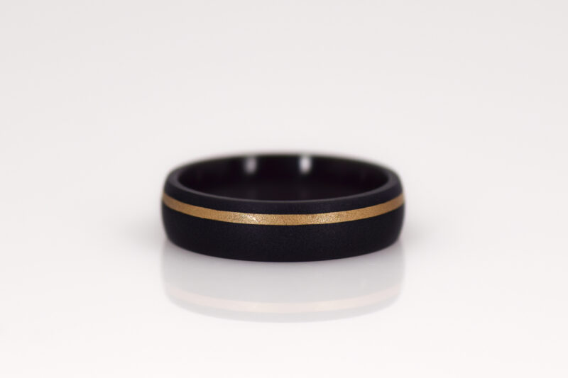 Jet-black, lustrous zirconium will withstand the many years you’ll wear this ring. And the strike of gold around its circumference—it’ll remind you to celebrate the small things.