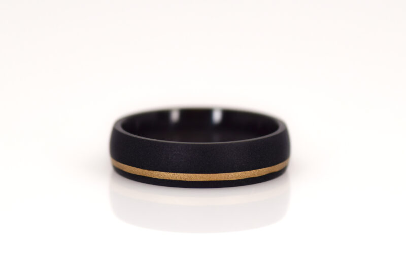 Metal: Black zirconium band, 14k yellow gold inlay.